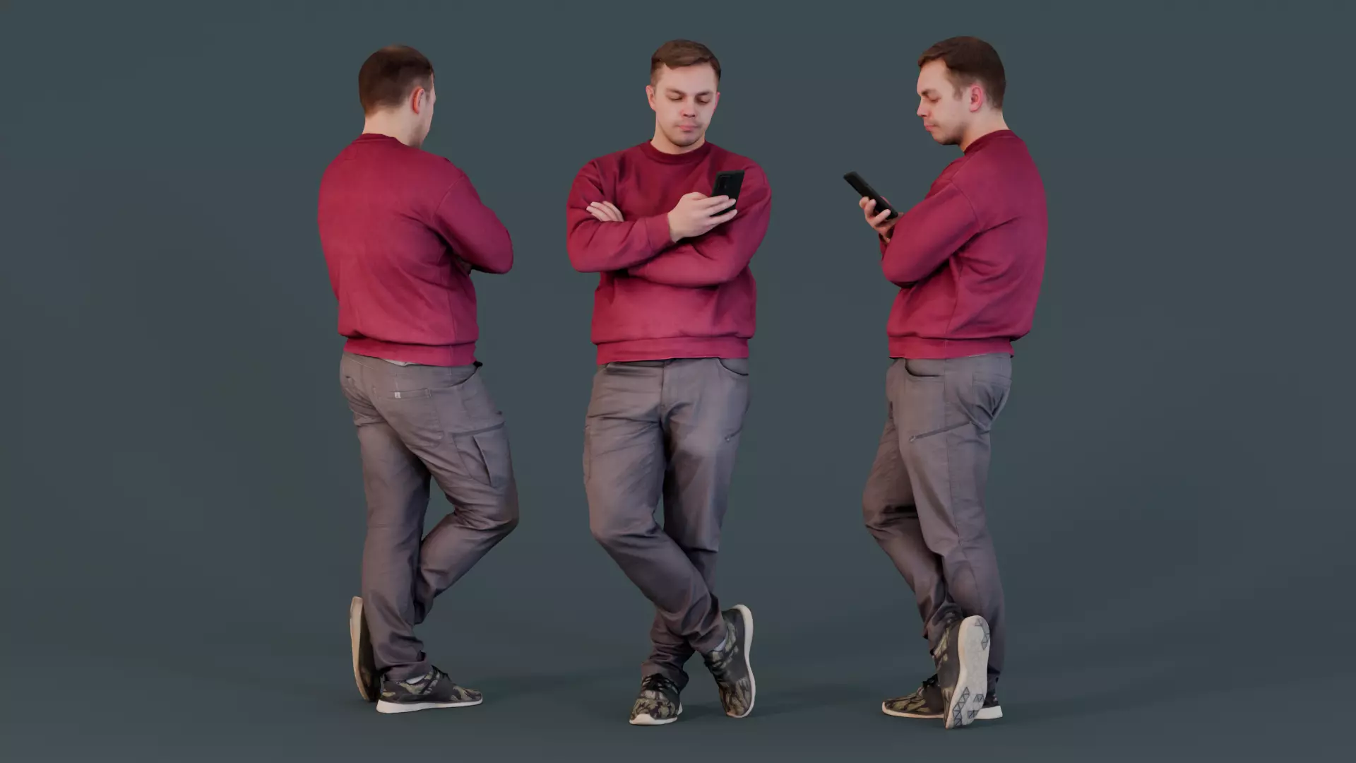 This 3D model showcases a man in a casual red sweatshirt, gray pants, and sneakers, engaged with his smartphone. His relaxed stance with arms crossed and focused gaze conveys a modern lifestyle. Perfect for scenarios depicting urban or tech-oriented settings.