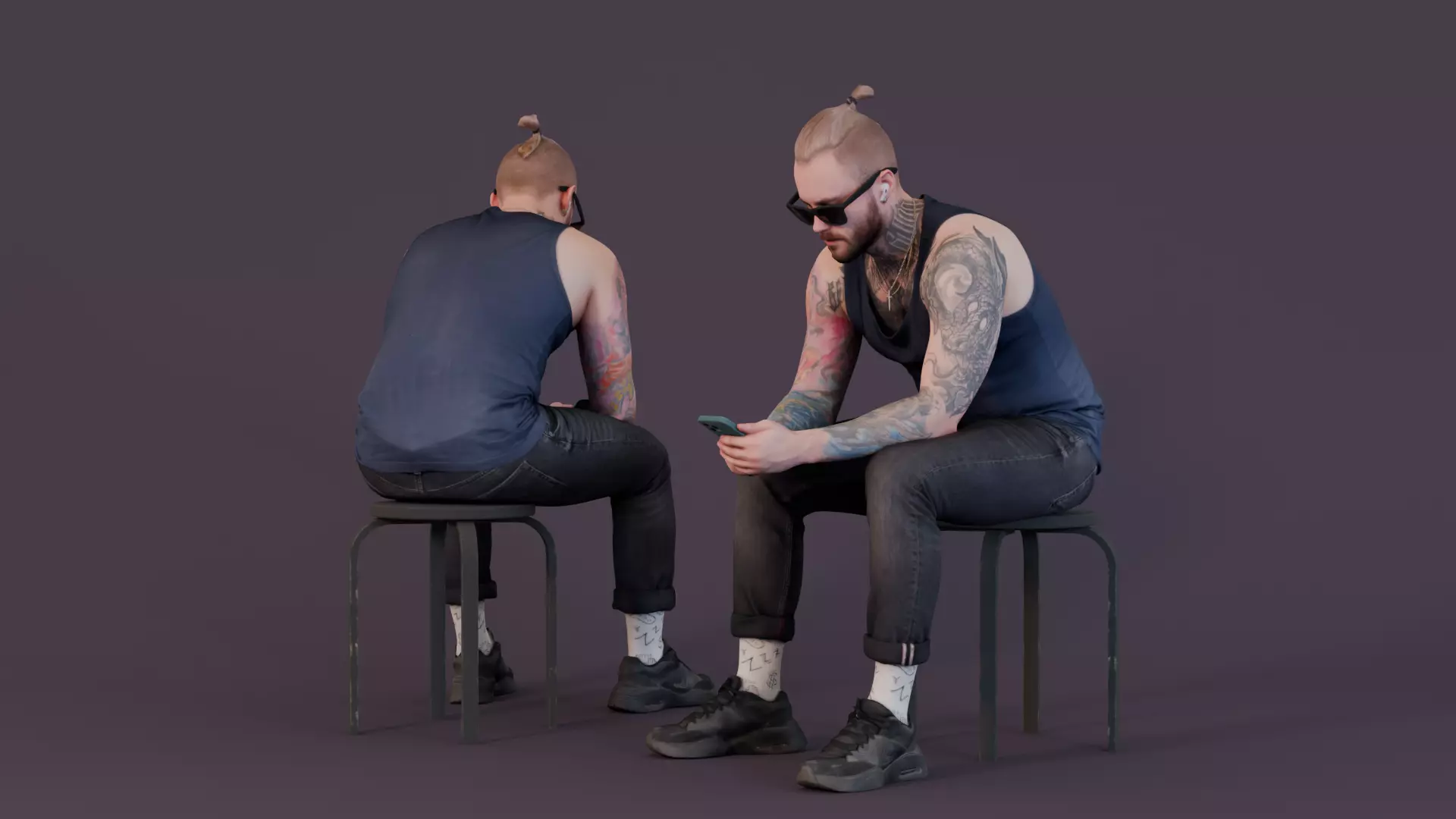 This 3D model features a young, tattooed man seated, engrossed in his smartphone. Dressed casually in a navy tank top, rolled-up black jeans, stylish sneakers, and sporting sunglasses, he has a relaxed yet focused demeanor. The model captures a modern, urban vibe with his tattooed arms and contemporary style, making him a perfect addition for street, café, or urban setting scenes. His seated posture with a slight lean forward suggests he's taking a break, checking messages, or browsing online, adding a realistic touch to background scenes.