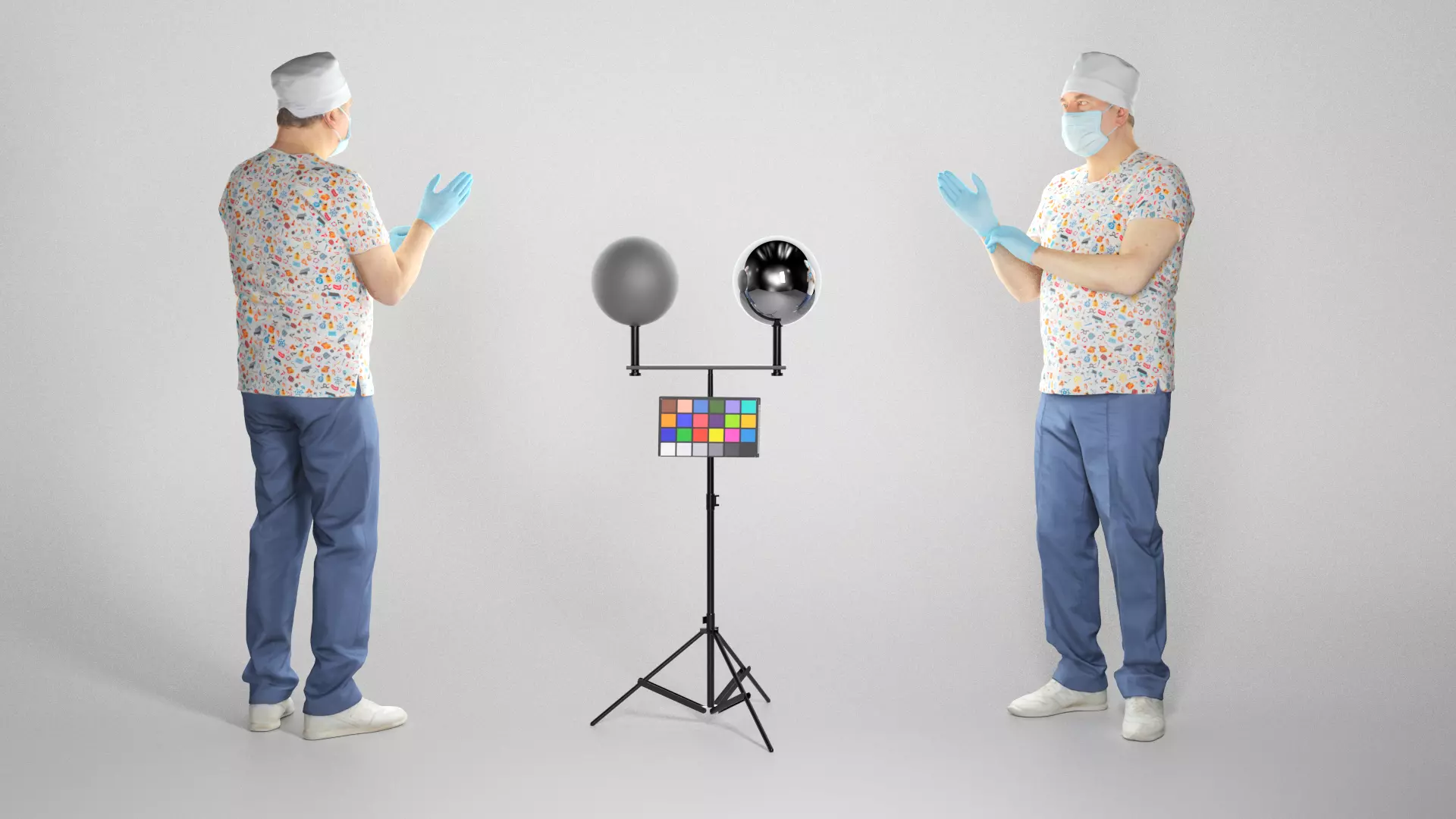 This is a true human size and detailed model of an adult man of Caucasian appearance dressed in a surgical uniform. The model is captured in casual pose to be perfectly matching to variety of architectural visualization, background character, product visualization, e.g. advert banners, professional products/devices presentations, VR/AR content, etc.