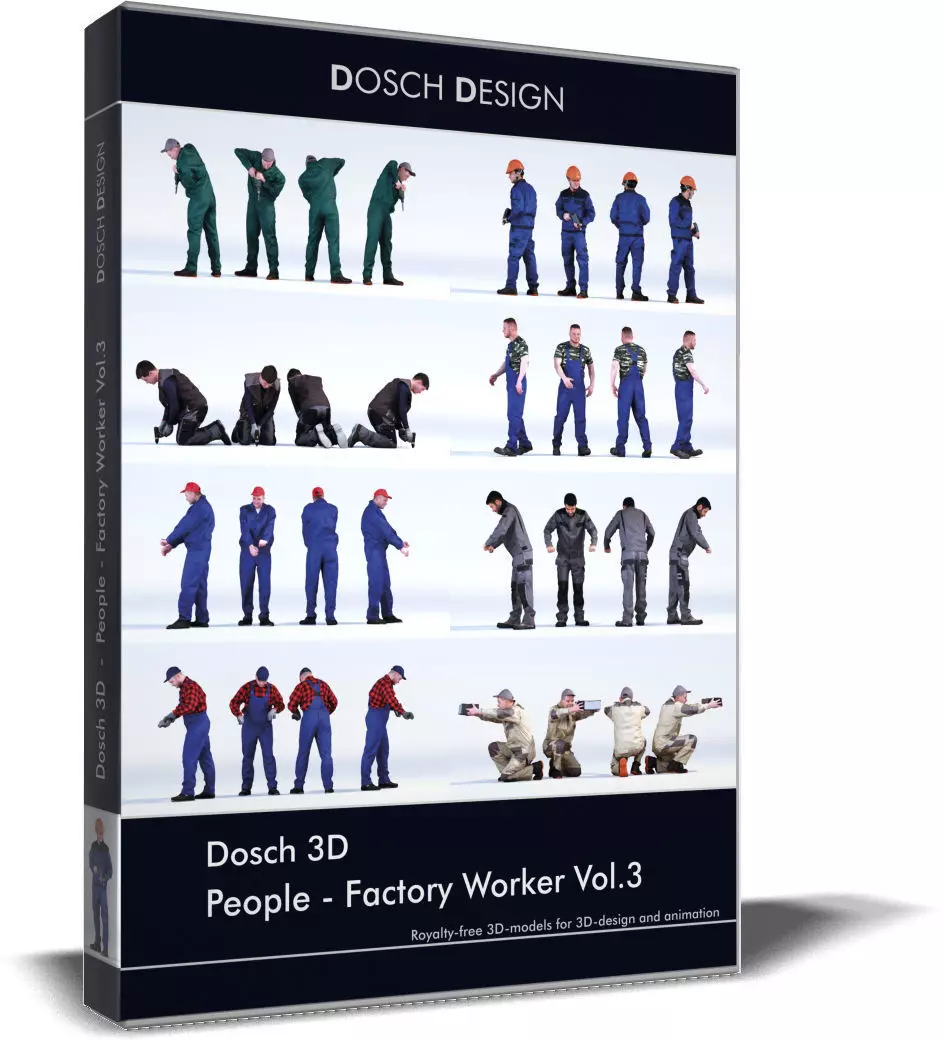DOSCH 3D: People - Factory Worker Vol. 3 is a set of 10 realistic 3D-models of people designed for use in factory or industrial settings.