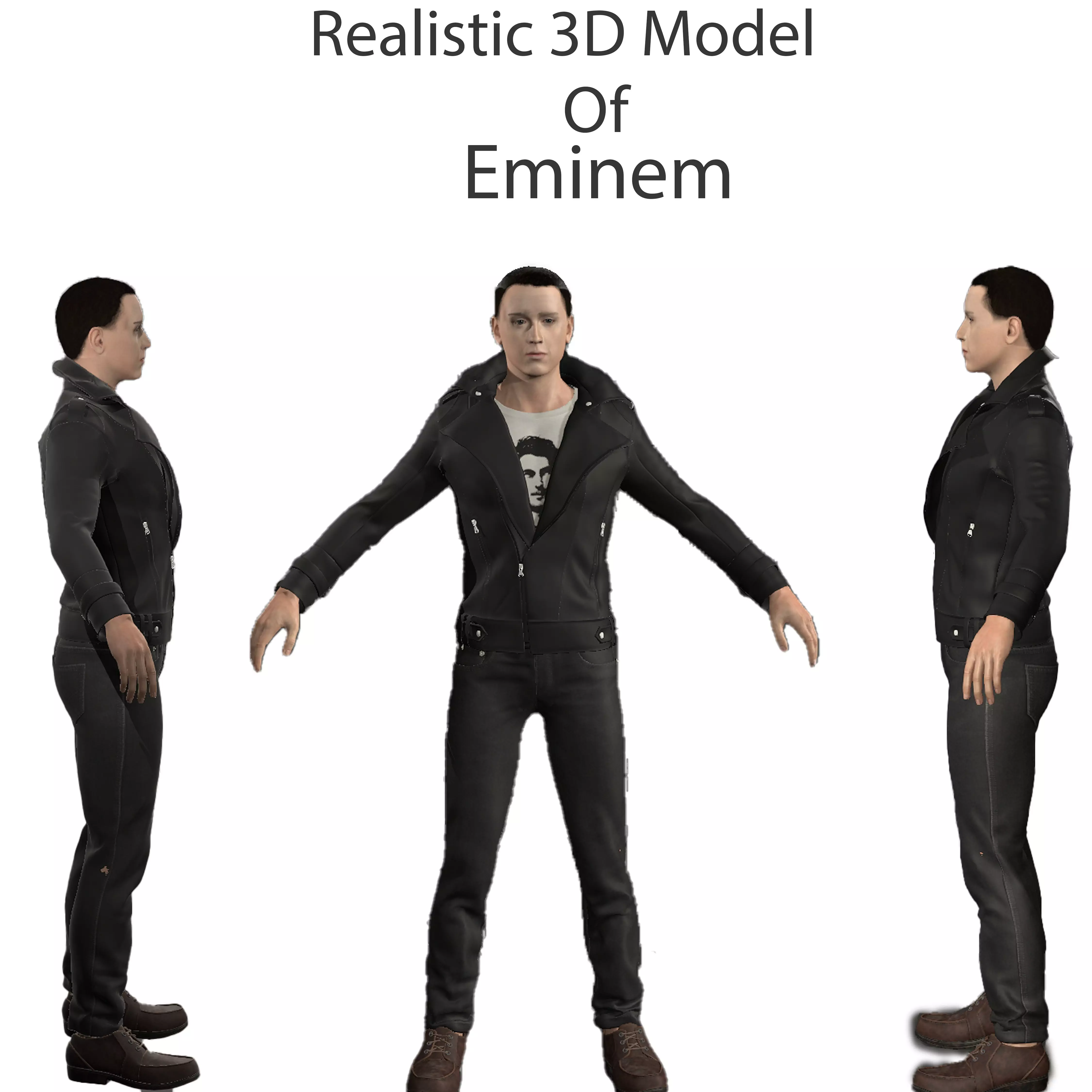 Introducing a breathtakingly realistic 3D model of Eminem, the iconic Grammy-winning rapper and global superstar known for his electrifying performances and lyrical prowess. This meticulously crafted digital creation offers an unparalleled opportunity to incorporate the dynamic presence and undeniable talent of Eminem into a wide range of multimedia projects.The Eminem 3D model captures the essence of this esteemed artist, meticulously sculpted to flawlessly replicate his distinct facial features, intense gaze, and commanding stage presence. From his signature bleached hair to his piercing eyes, every intricate detail has been meticulously crafted, resulting in an astonishingly lifelike and visually captivating representation of Eminem.Equipped with advanced rigging and animation capabilities, this model empowers animators to bring Eminem's electrifying energy and unique style to life with precision and fluidity. Whether it's capturing his dynamic stage movements, evoking his intense emotions, or showcasing his distinctive rap flow, the model allows animators to recreate Eminem's captivating performances with unparalleled realism.For multimedia projects such as music videos, virtual concerts, or promotional content, the Eminem model becomes an invaluable asset in capturing the essence of this iconic artist. With his groundbreaking music and thought-provoking lyrics, Eminem has pushed boundaries and influenced a generation of artists. The model provides an authentic representation, allowing filmmakers and content creators to capture his essence and deliver a visually stunning and emotionally engaging experience.The hyper-realistic features and attention to detail in the Eminem 3D model enable its seamless integration into virtual environments, interactive applications, and gaming platforms. Whether it's creating immersive music experiences, developing rhythm-based gameplay, or featuring Eminem as a character within a virtual world, the model adds an authentic and captivating presence, elevating the overall user experience to new heights.With its unparalleled quality, adaptability, and meticulous craftsmanship, the Eminem 3D model stands as an invaluable asset for professionals in the music, entertainment, and gaming industries. By incorporating this hyper-realistic and captivating character, portrayed by Eminem, into your projects, you can bring the energy, talent, and unmistakable charisma of this legendary rapper to life, captivating your audience and leaving a lasting impression.