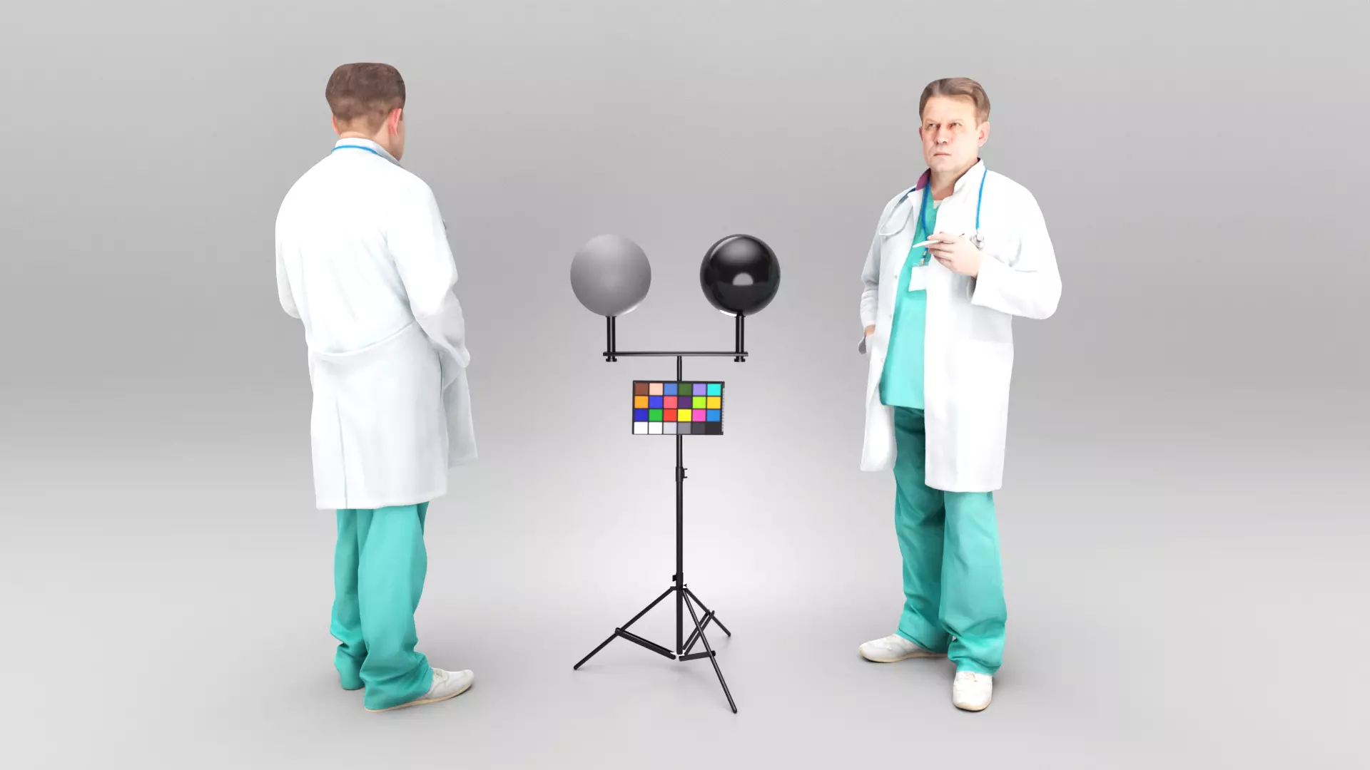 This is a true human size and detailed model of a man of Caucasian appearance dressed in a medical uniform. The model is captured in typical professional pose to perfectly match a variety of architectural and product visualizations, be used as a background or mid-sized character in advert banners, professional products/devices presentations, educational tutorials, VR/AR content, etc.