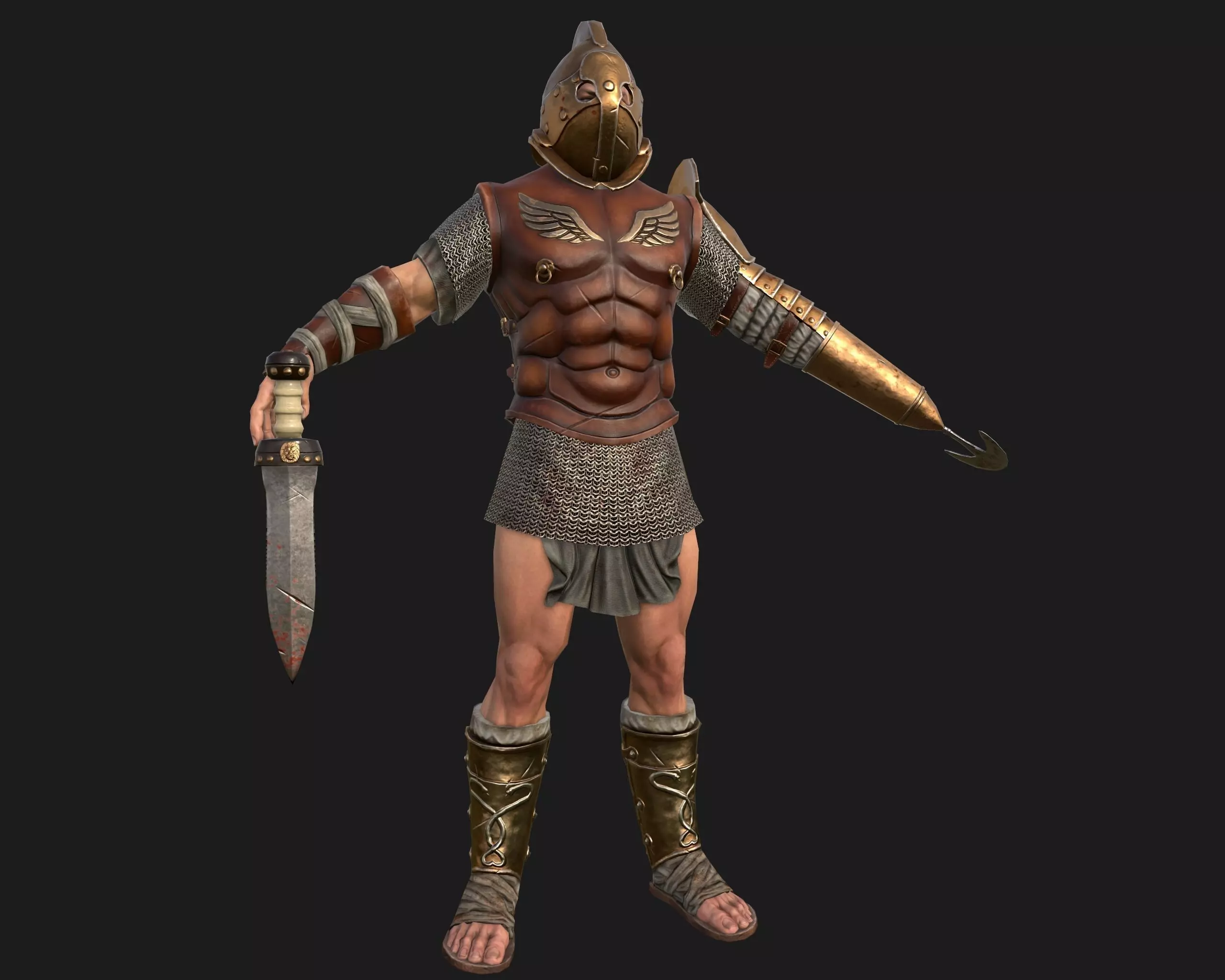 Realistic low poly model of gladiator ready for Virtual Reality (VR), Augmented Reality (AR), games and other real-time apps. Model with weapons and armor has 9,431 polygons, 18,436 triangles and 9,575 vertexes. 5 texture 2048x2048 maps in tga: diffuse, roughness, metalness, normal, ambient occlusion.Available File Formats: -FBX