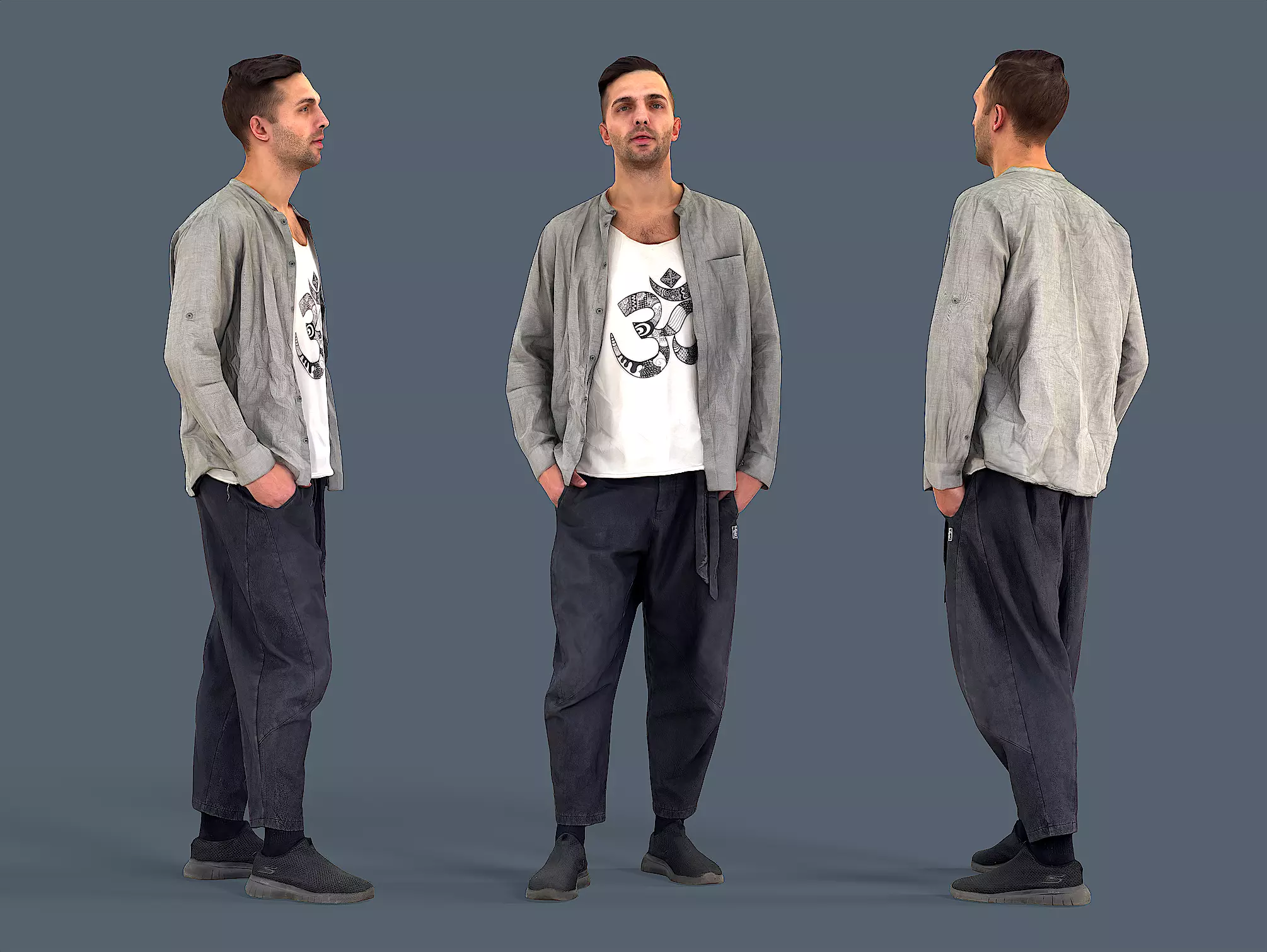 A young dark-haired handsome guy with stubble on his face stands and looks straight. He wears a crumpled gray linen shirt, a white T-shirt and Japanese-style wide leg pants.