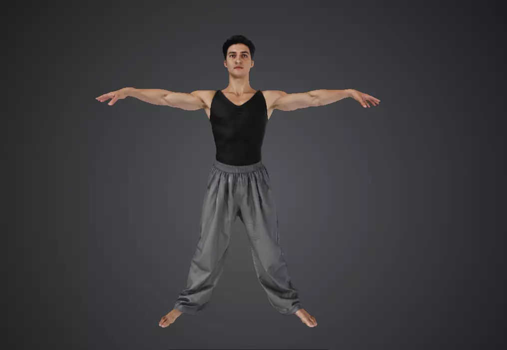 Overview Add a touch of dynamic life to your renders with this high-quality Contemporary Male Dancer. This character model features a realistic athletic build, captured in a clean studio pose with arms extended. Wearing a black athletic tank top and loose-fitting grey performance trousers, the model highlights detailed fabric folds and realistic muscle definition. It is an ideal asset for dance studio visualizations, fitness advertisements, or as a reference for anatomical studies.