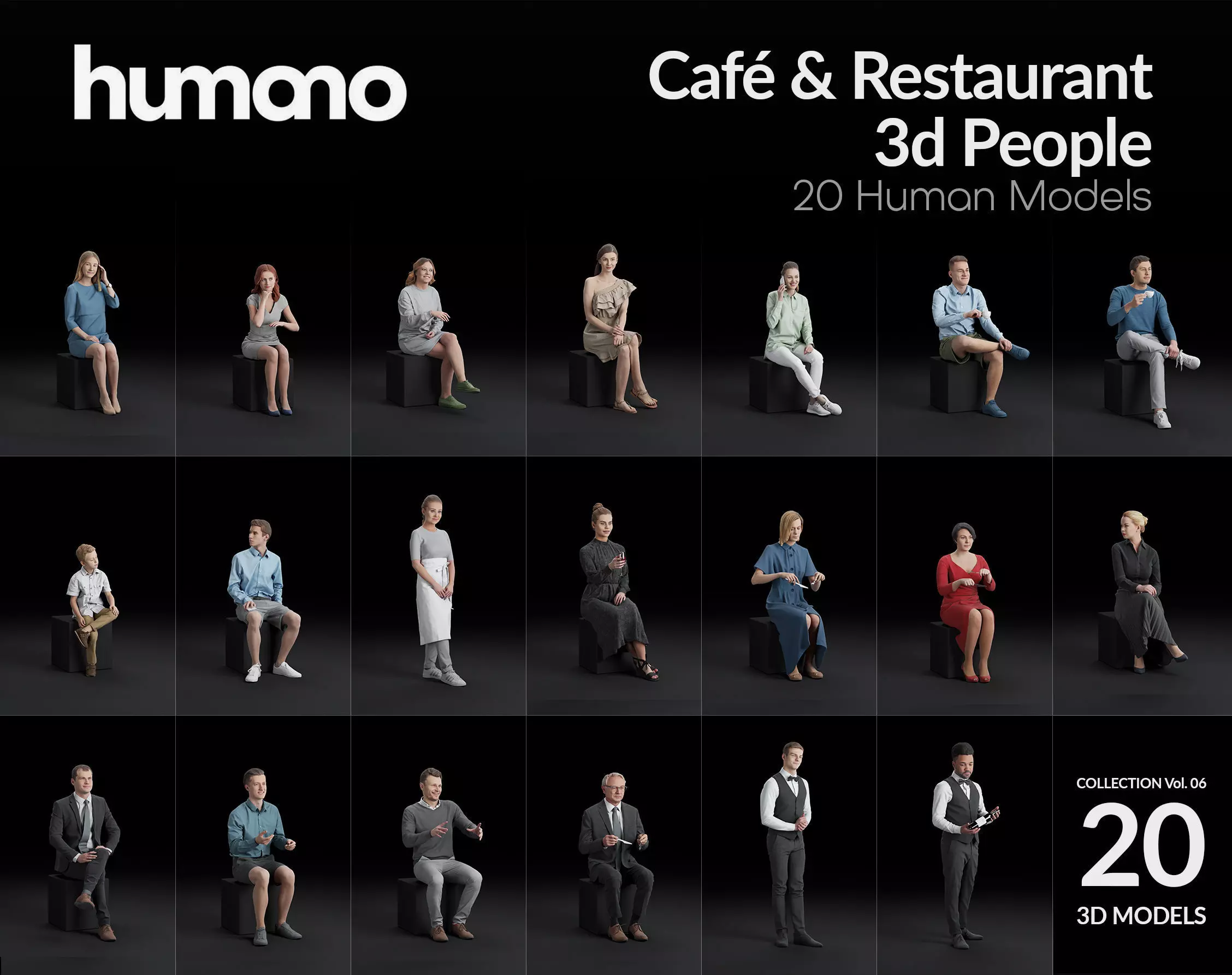 Humano 20-Collection 06 CAFE RESTAURANT SITTING 20 x 3D models 3D model