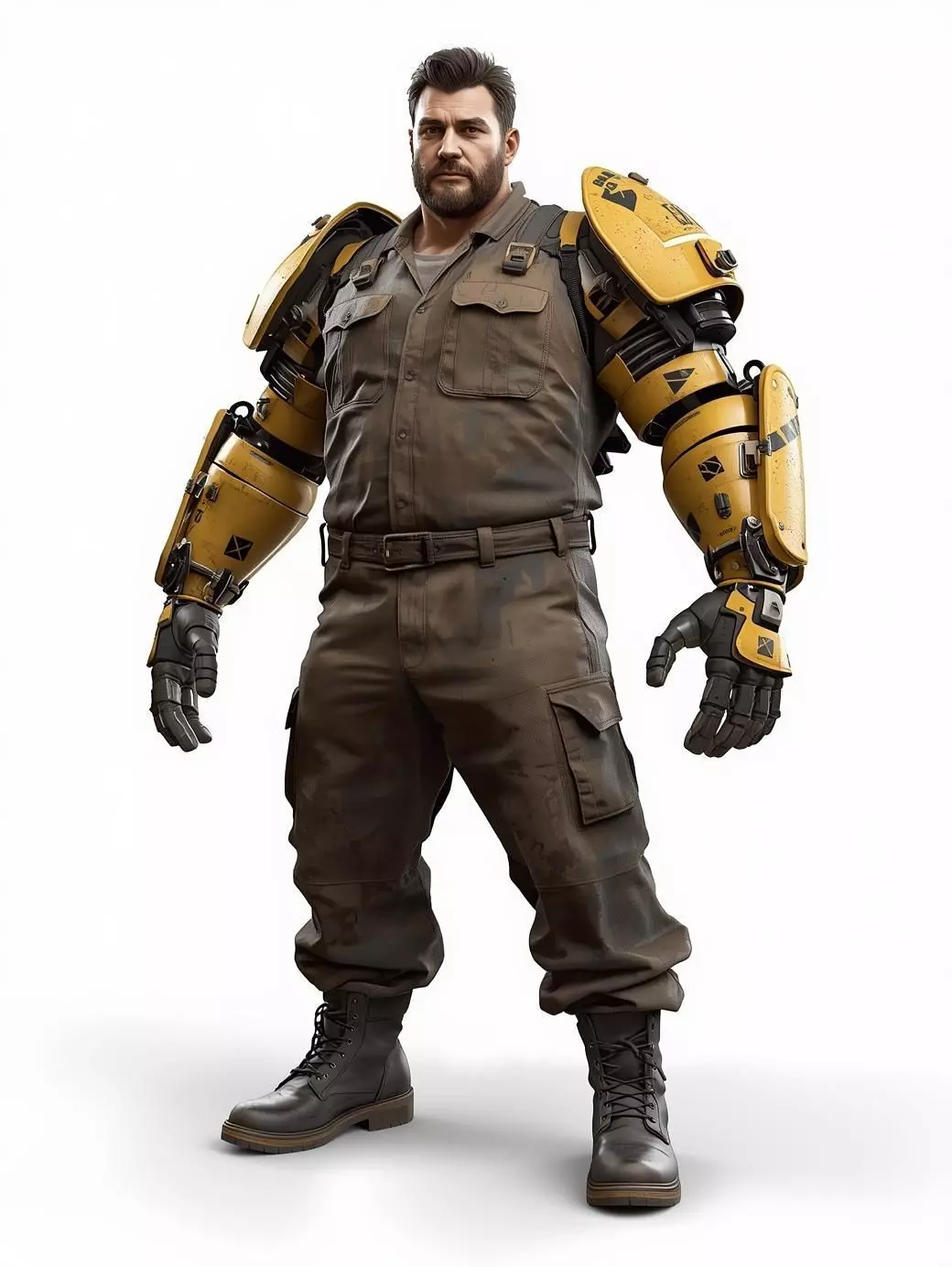Key FeaturesDesign: Male industrial worker augmented with a hydraulic exoskeleton for heavy labor.