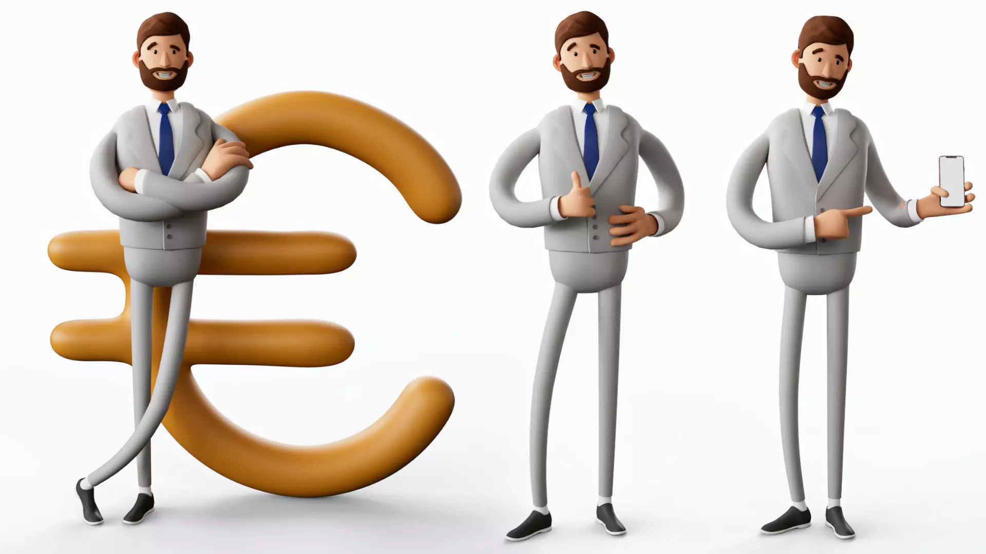 It is a cartoon character of a businessman . The model has Uv's as well as all other decor in case if you want to add or change your own texture. Choose whatever pose you want by choosing different frames - use 24fps. Check out instuction preview to choose pose you want. Coins has no material use any metalic mat you want. iPhone alembic with selection for easy assign materials. Cinema4D setup scene with all the materials for Redshift render. Maya file with RIG to change the pose or to make some animation.