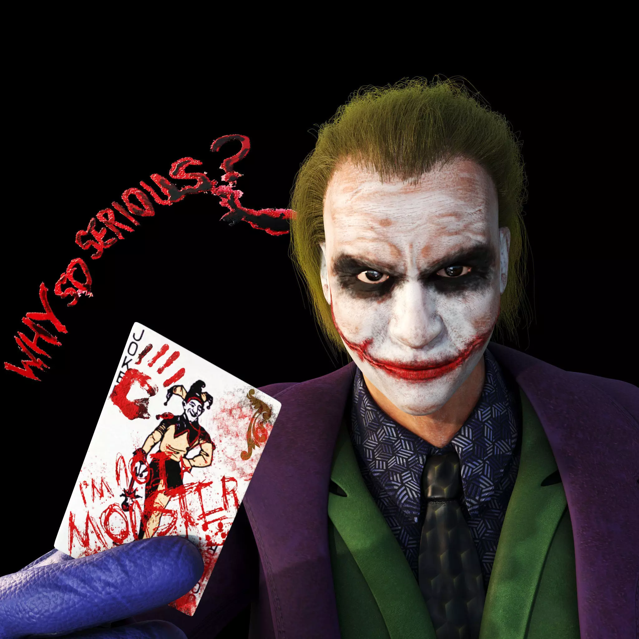 Joker from DC comics universe. For base reference taken Joker character that was played by actor Heath Ledger in Christopher Nolan's 2008 superhero film The Dark Knight. Based upon the DC Comics. Hair made by usin native 3ds max hair and fur modifyer, so it works only within 3ds max.Export files obj and fbx don't have hairs.
