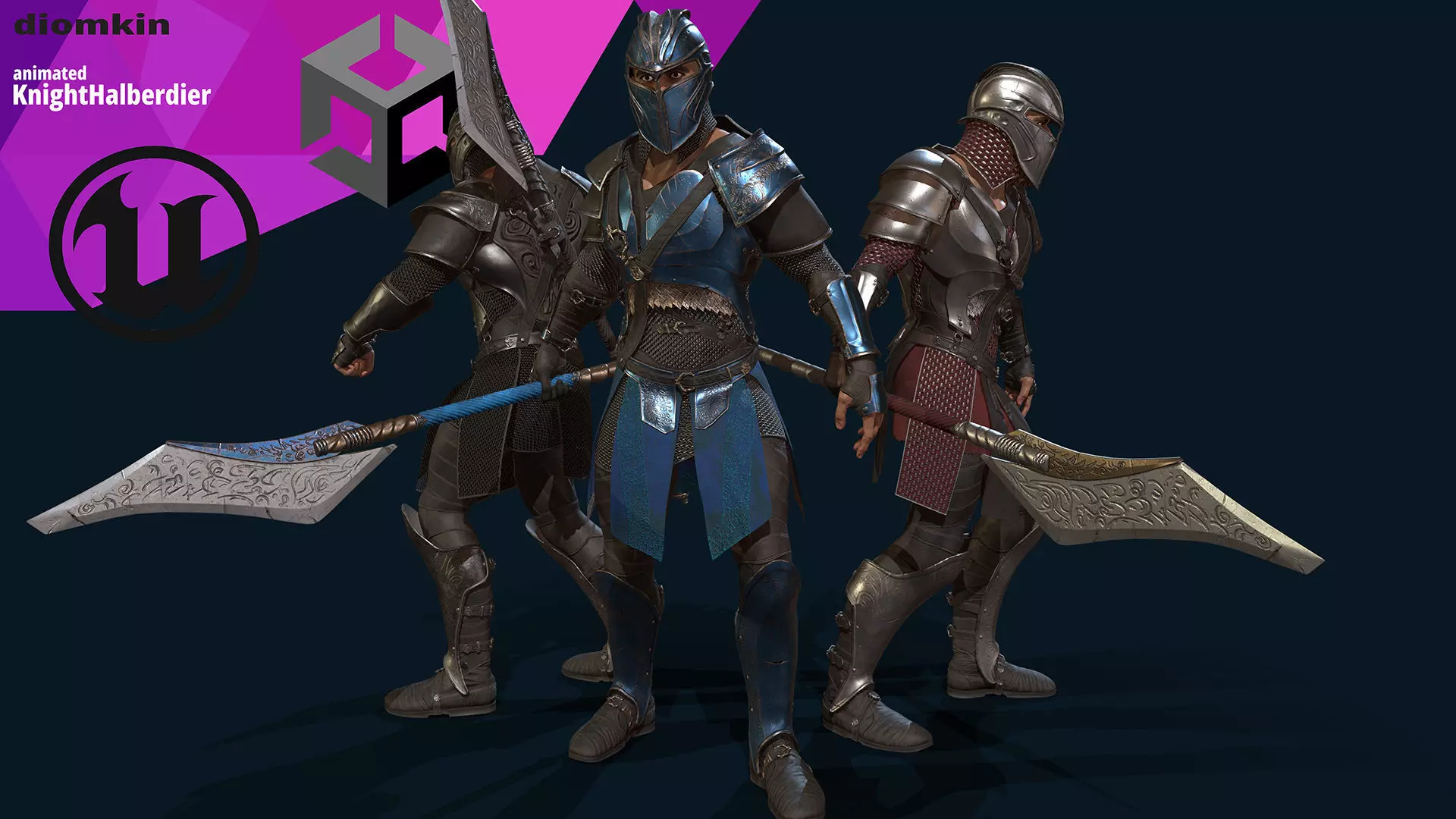 • The Knight Halberdier model contains 3 skins, 25 materials, 135 PBR textures 4096x4096, 27 animations, blendshapes, EpicSkeleton + extra bones for cloth, weapone: