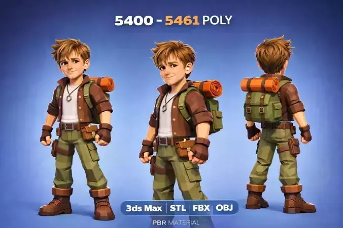 The hair is modeled in a low poly style with a natural fringe falling slightly onto the forehead, adding personality while keeping the geometry lightweight. The outfit follows an adventure theme with basic clothing, boots, and a backpack, suitable for exploration, RPG, survival, and indie games.
