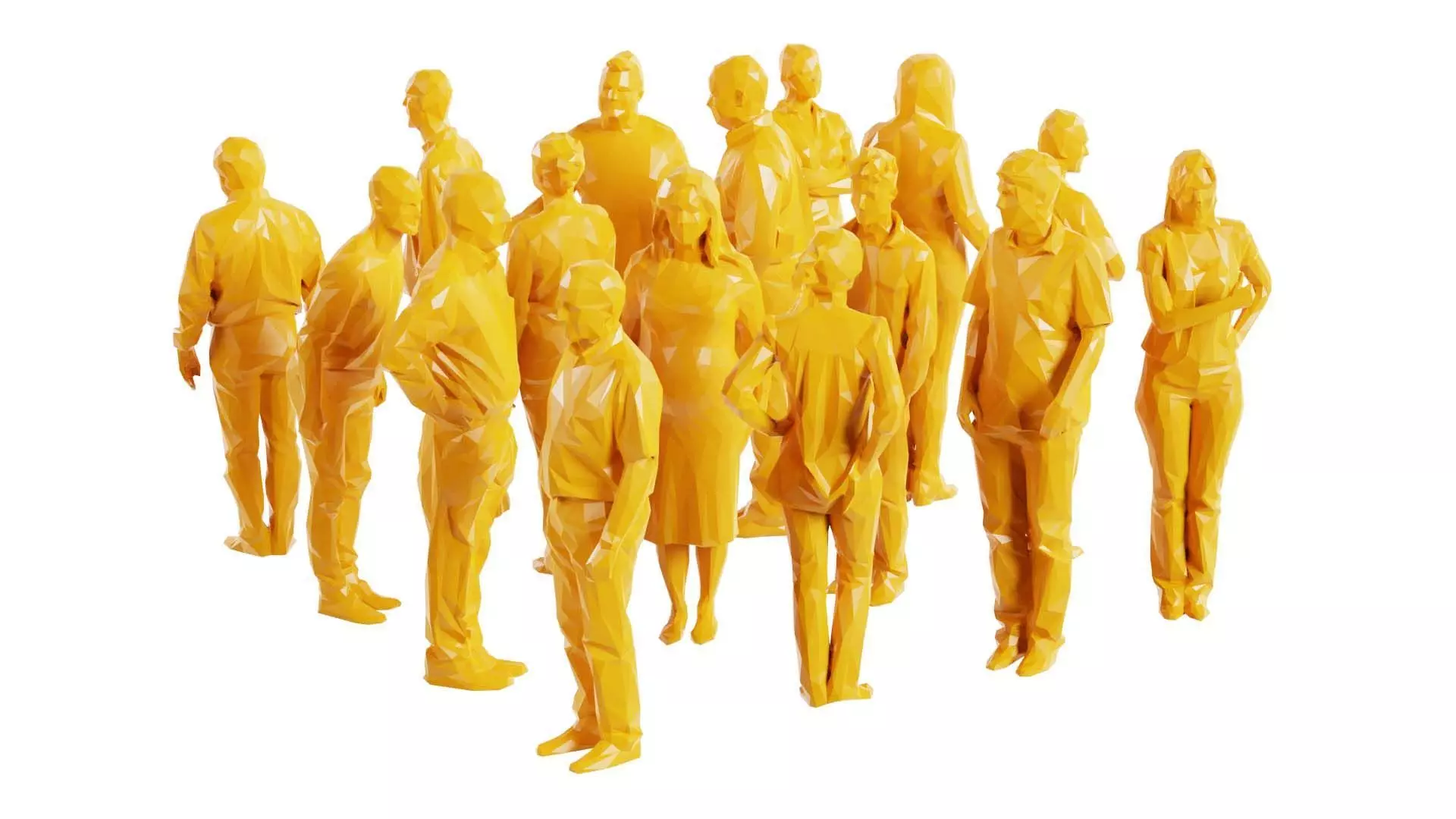 Polygonal Miniatures presents low poly persons 1, a model from our 3D scanned catalogue. The model, a group of people standing together, is obtained by photogrammetry, and scanned using SLR camera's.Processing takes place in Zbrush and Photoshop and the resulting 3D model has unwrapped, non overlapping UV's, and a texture and normal map. Before publishing, we make sure the model has real world scale (meters), correct shader setup and is centered at the origin.Apart from the various file formats, we also offer a Blender file with material and textures set-up, ready for export and rendering. More info can be found below: