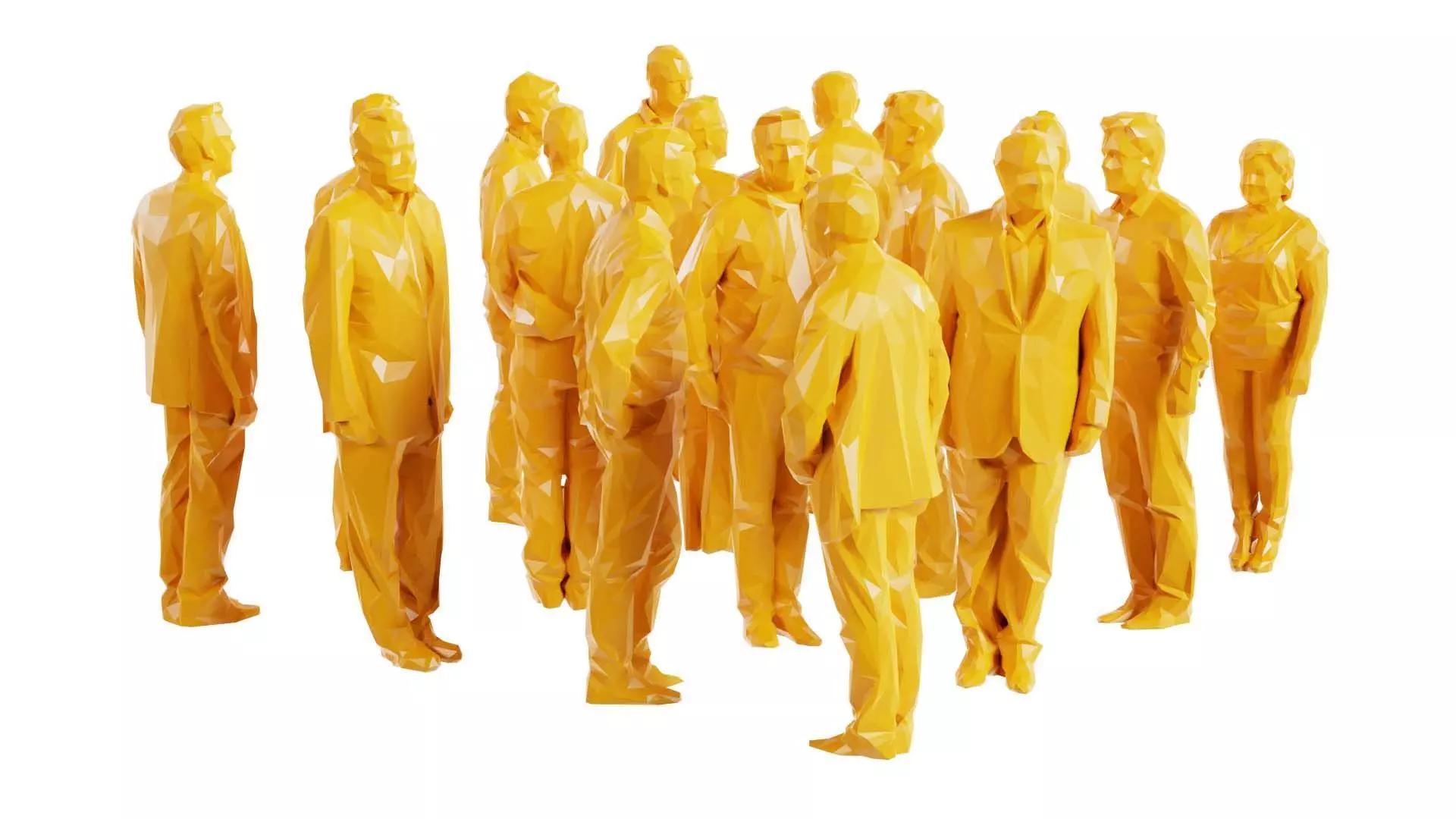 3D scanned model featuring a group of figurines standing in a line. This model, low poly persons 2, has been created using photogrammetry from a real world object.The raw scan data has been cleaned, retopologized and UV-unwrapped using Zbrush. The result is a low poly mesh with baked maps. The .obj and .mtl are configured so that maps will load automatically in the shader (tested in Blender). In addition, a Blender scene is provided with the model and shader already set up for rendering and export. Detailed information below: