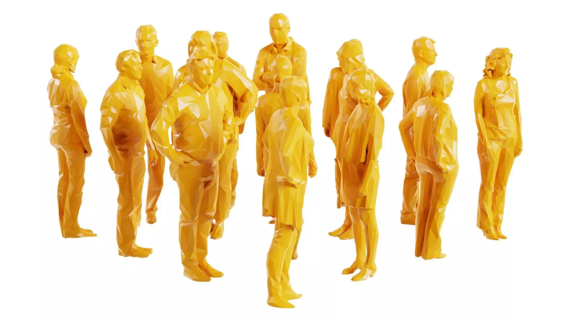 This model, low poly persons 9, has been created using photogrammetry from a real world object. It is featuring a group of figurines standing together.The 3D Model is part of the Polygonal Miniatures Remastered collection, which has been optimized with better shaders, correct scaling (meters) and centered position.We use multi camera capturing in the 3D scanning process. The scan data is cleaned and processed in Zbrush and Photoshop. In the end, the low poly product contains unwrapped UV's, textures and normals maps. Detailed specifications can be found below: