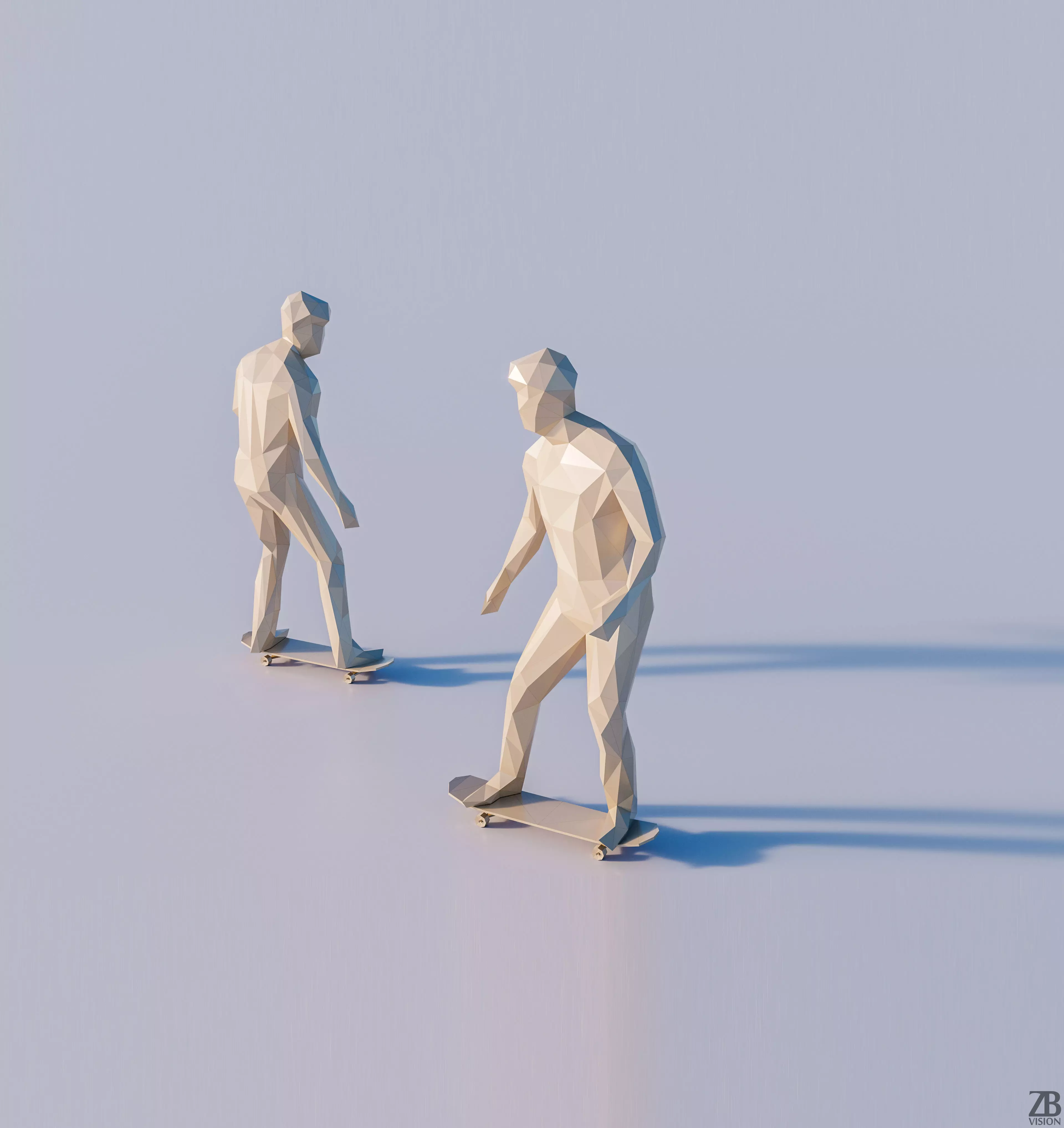 This is a lowpoly 3d model of a generic man riding a skate. The lowpoly skater was modeled and prepared for low-poly style renderings, background crowd, and general CG visualization. The 3d man on skate is ready to be inserted in your scene out of the box.