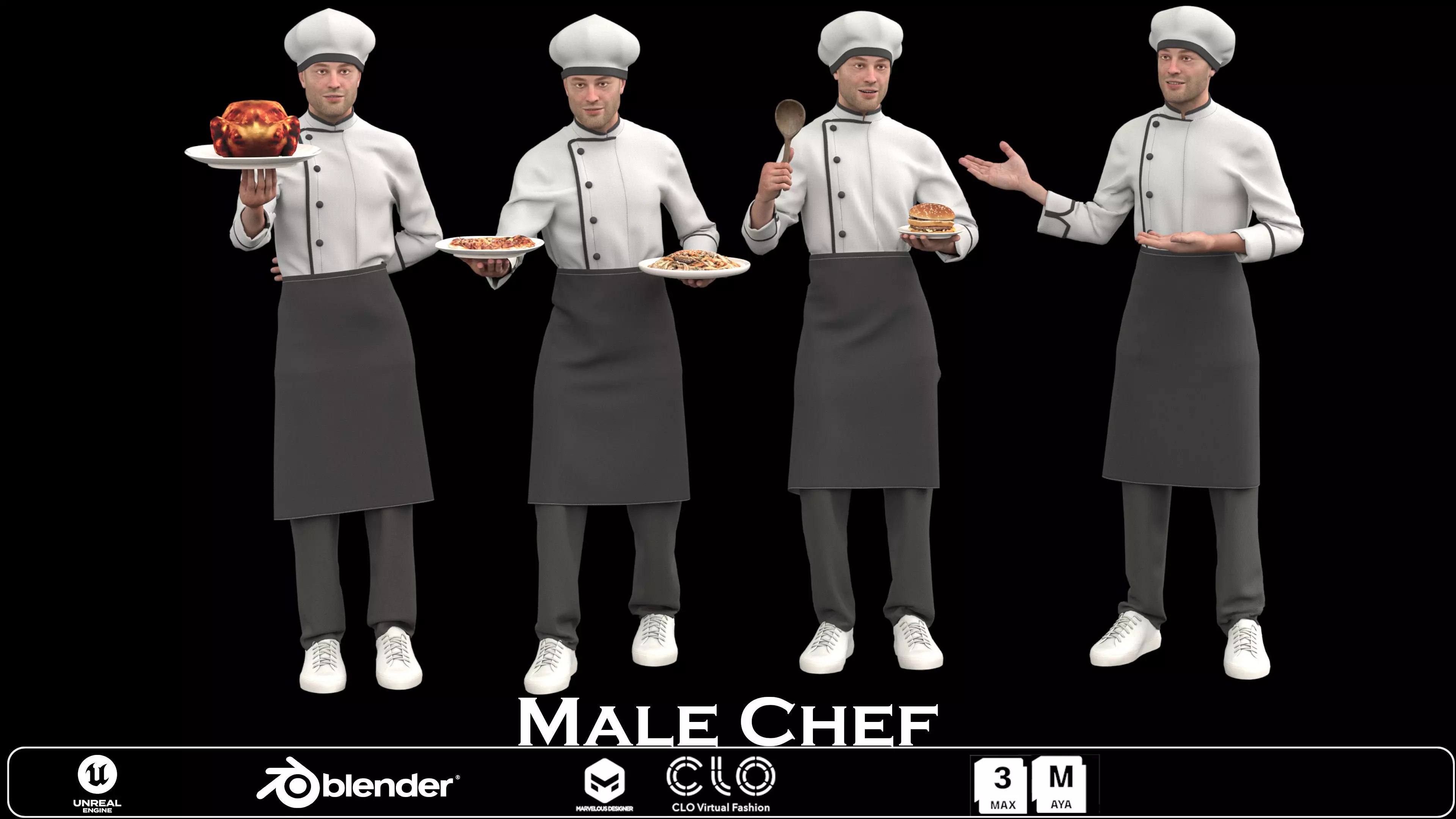 Realistic Design: The chef is fully detailed, from the uniform to the facial features, ensuring a lifelike appearance.Dynamic Poses: Four versatile poses—holding a roasted chicken, a plate of spaghetti, a burger, and gesturing with a ladle—provide flexibility for various culinary scenes.High-Quality Detailing: Meticulously crafted to ensure realistic textures and refined details, from the fabric of the uniform to the food items.Optimized for Rendering: Compatible with Blender, Unreal Engine, Unity, and 3ds Max for seamless integration into your workflow.