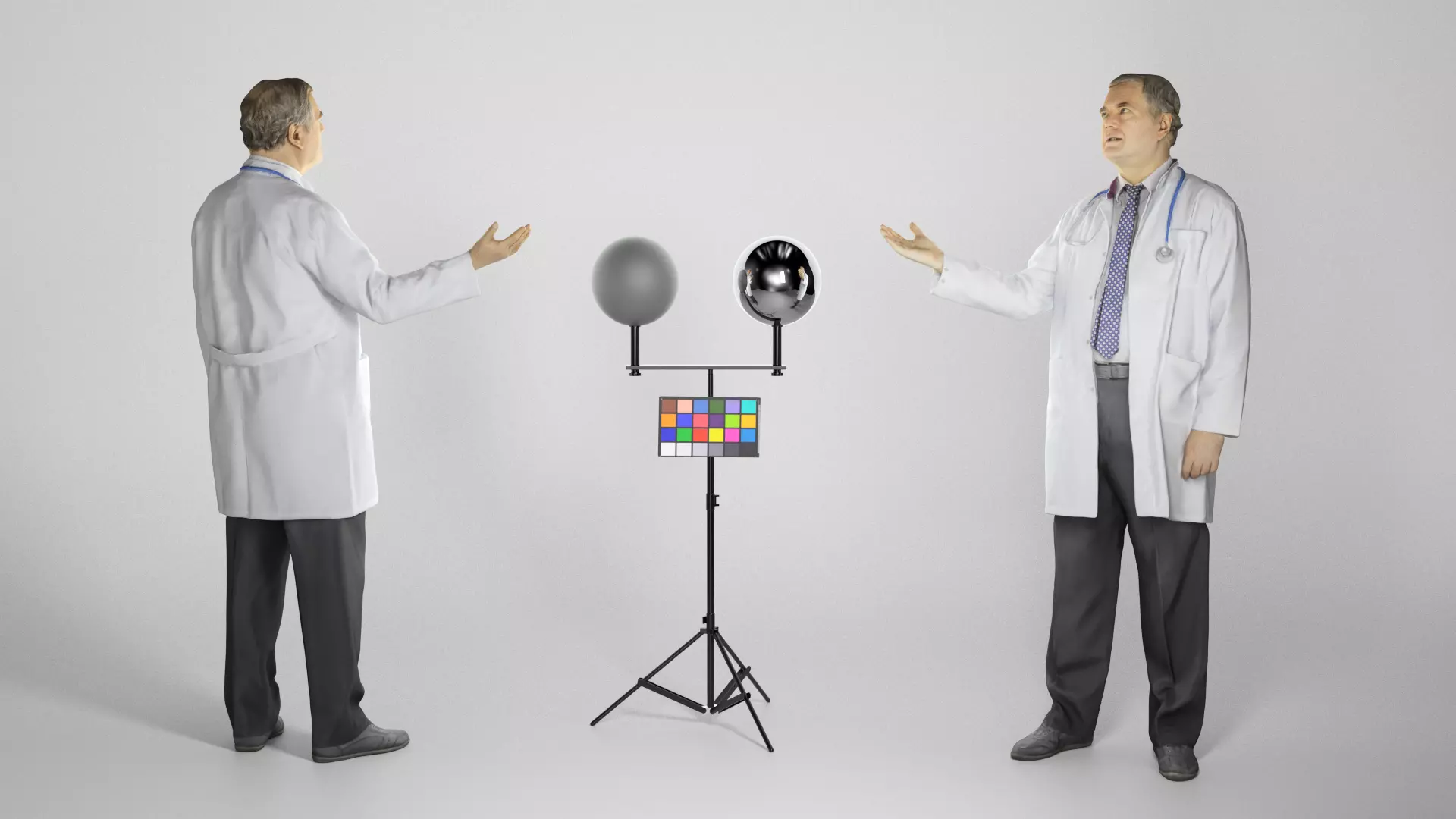 This is a true human size and detailed model of a adult man of Caucasian appearance dressed in a uniform of a medical doctor. The model is captured in casual pose to be perfectly matching to variety of architectural visualization, background character, product visualization, e.g. advert banners, professional products/devices presentations, VR/AR content etc.