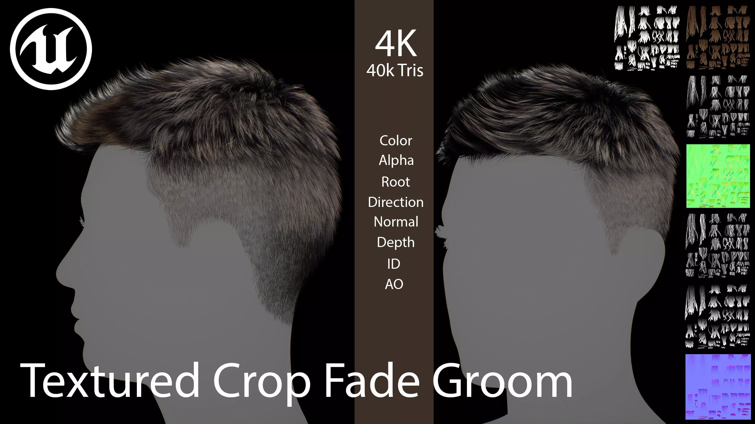 Male Textured Crop Fade is a game-ready real-time hair asset created for games, cinematics, and other real-time applications. The hair textures were created in FiberShop and optimized for Unreal Engine 4 and 5, offering a good balance of performance and visual quality.
