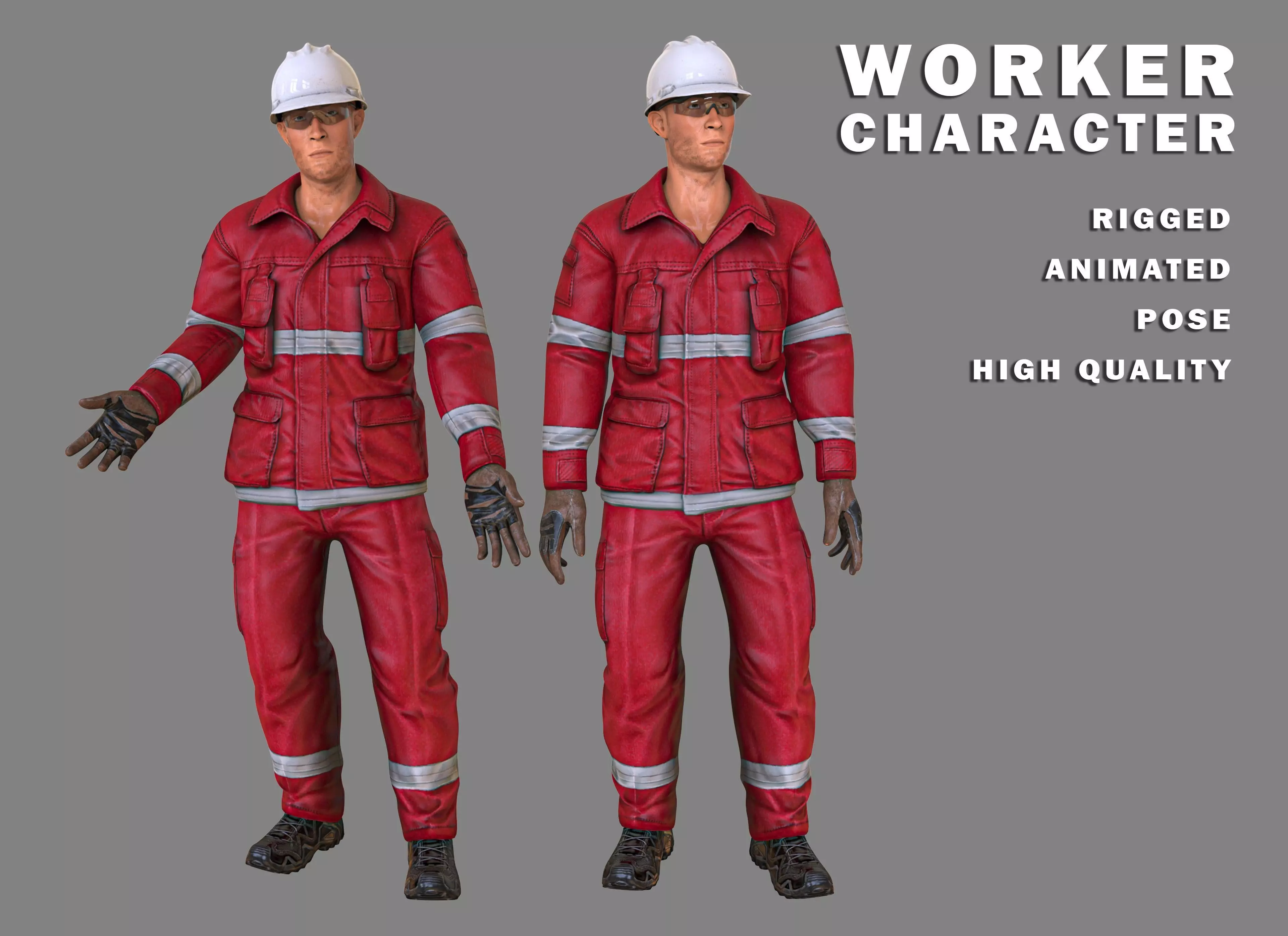 Realistic low-poly male worker character model suitable for animation, game characters, and interior design posing. T-pose included for easy rigging, as well as rigged and animated files.