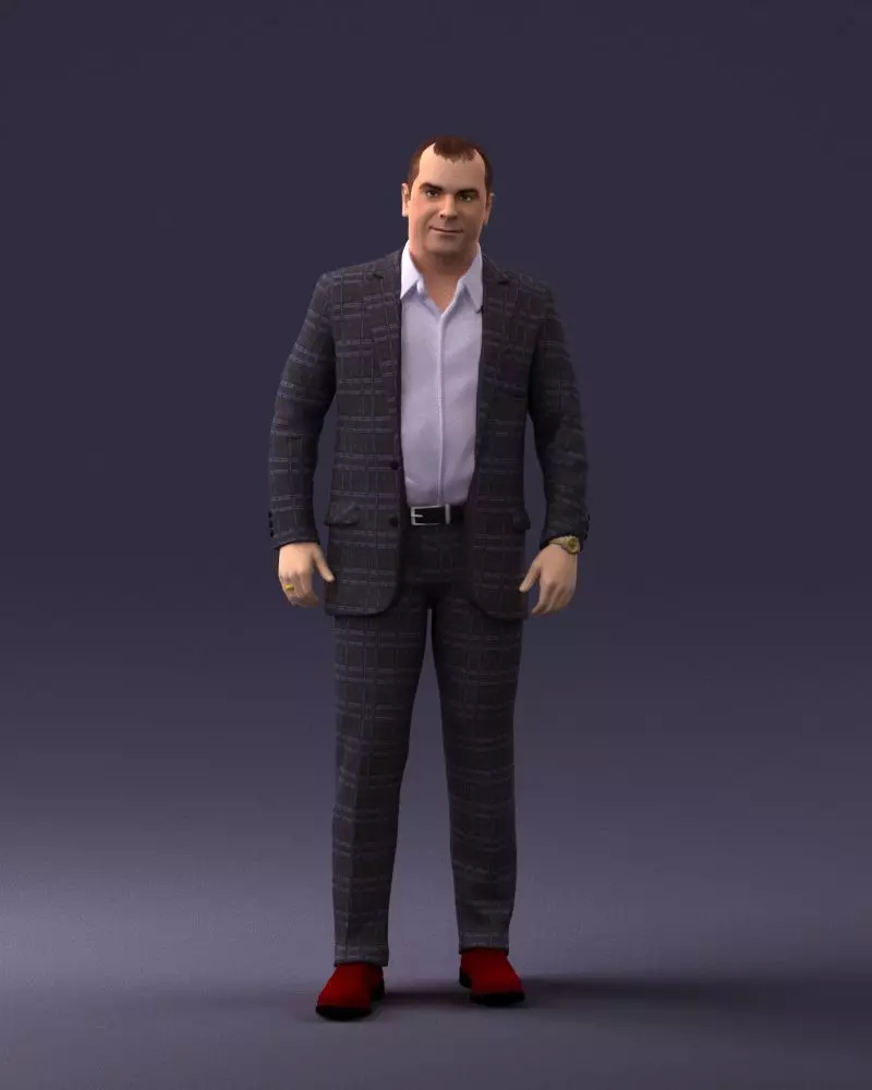 A realistic 3D model of a man in a checked suit, created using 3D scanning technology. The character is dressed in a formal jacket, shirt, trousers, and shoes, with fine details on clothing and accessories. This asset is ideal for creative or professional projects requiring realistic human characters. Suitable for architectural visualizations, commercials, cinematic projects, crowd simulations, and advertising scenes.