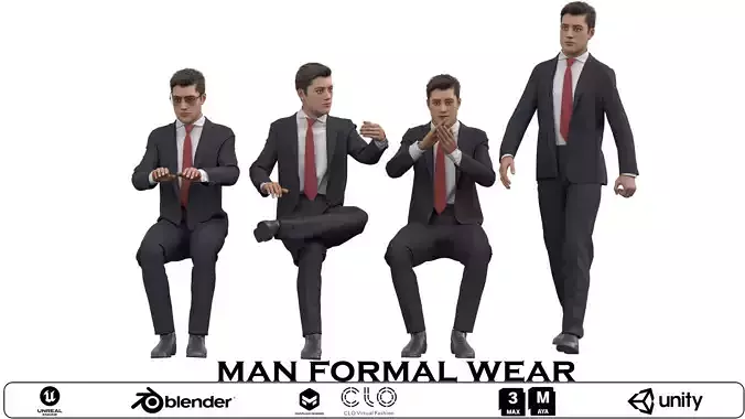 Name: Man in Formal Wear - Posed & Rigged Business CharacterType: modelFormat: 3Ds Max 2013Export: FBX, OBJRender: VRay (5.x), Corona (6)Polys: 534736Verts: 470851Matclasses: Multimaterial,VRayMtl,CoronaMtlUnits: CentimetersDimension: 261.22 x 109.55 x 182.91Date: 2025.9.2This professional 3D businessman character model features four distinct poses showcasing versatile business interactions and presentations. The model displays exceptional attention to detail with a perfectly tailored charcoal business suit, crisp white dress shirt, and classic red tie, complemented by polished leather dress shoes. Each pose captures authentic business scenarios - from seated conference meetings and dynamic presentations to confident standing positions, making this asset ideal for corporate visualizations and professional environments.The character boasts realistic facial features, professionally styled hair, and natural hand gestures that convey confidence and authority. The high-quality textures include realistic fabric materials with proper suit draping and wrinkle details that maintain authenticity across all poses. Perfect for corporate presentations, business software interfaces, training materials, architectural office visualizations, and professional marketing content. The model is fully optimized for game engines and animation workflows, with clean topology suitable for further customization and rigging, ensuring seamless integration into any business-focused project.