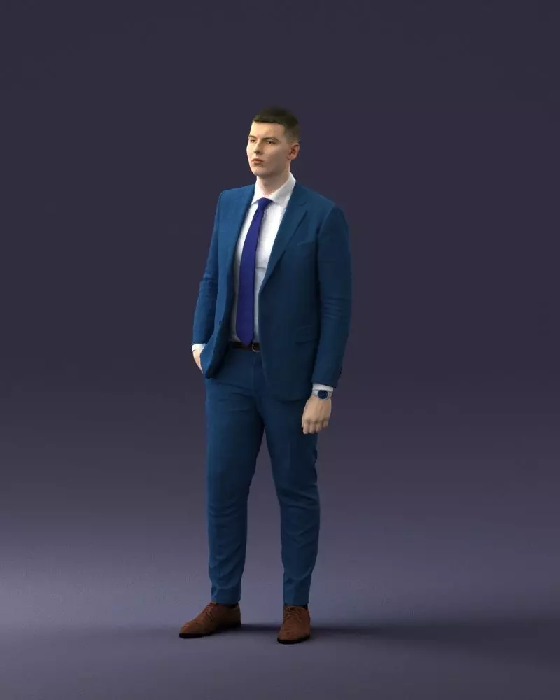 This is a high-quality 3D scan of a businessman dressed in a blue suit, white shirt, and tie. The model is detailed, with realistic posture, proportions, and textures, making it ideal for creative or professional projects requiring realistic human characters. Suitable for architectural visualization, advertising, cinematics, corporate storytelling, and training simulations.