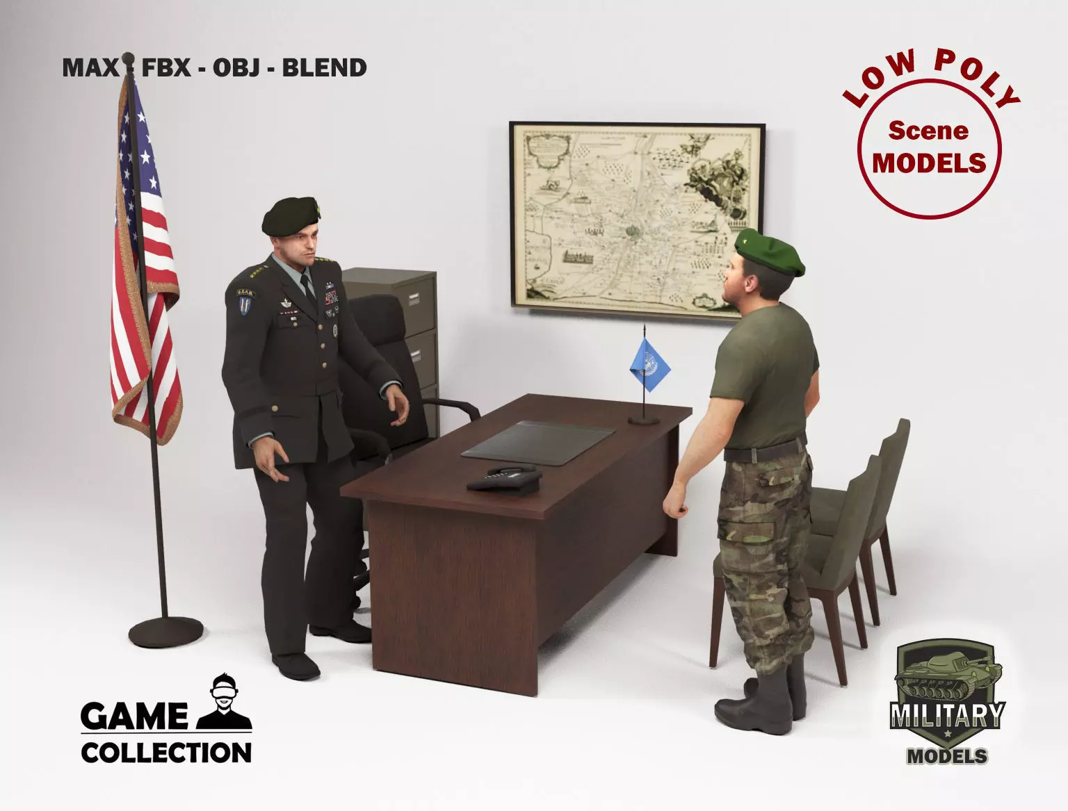 3D models of a soldier and a general in a military office with a desk, chairs, files, flags and a phone. The human bodies have bones to be able to modify the postures. The models has been created with 3D Studio Max 2022 and Blender 3.3. All the models are low poly, basic but realistic and are ideal for 3D scenes that require few polygons. They can be used for advertising visualitations and also for games or applications. It has been created in different 3D Studio Max versions and also in FBX, OBJ and blend.