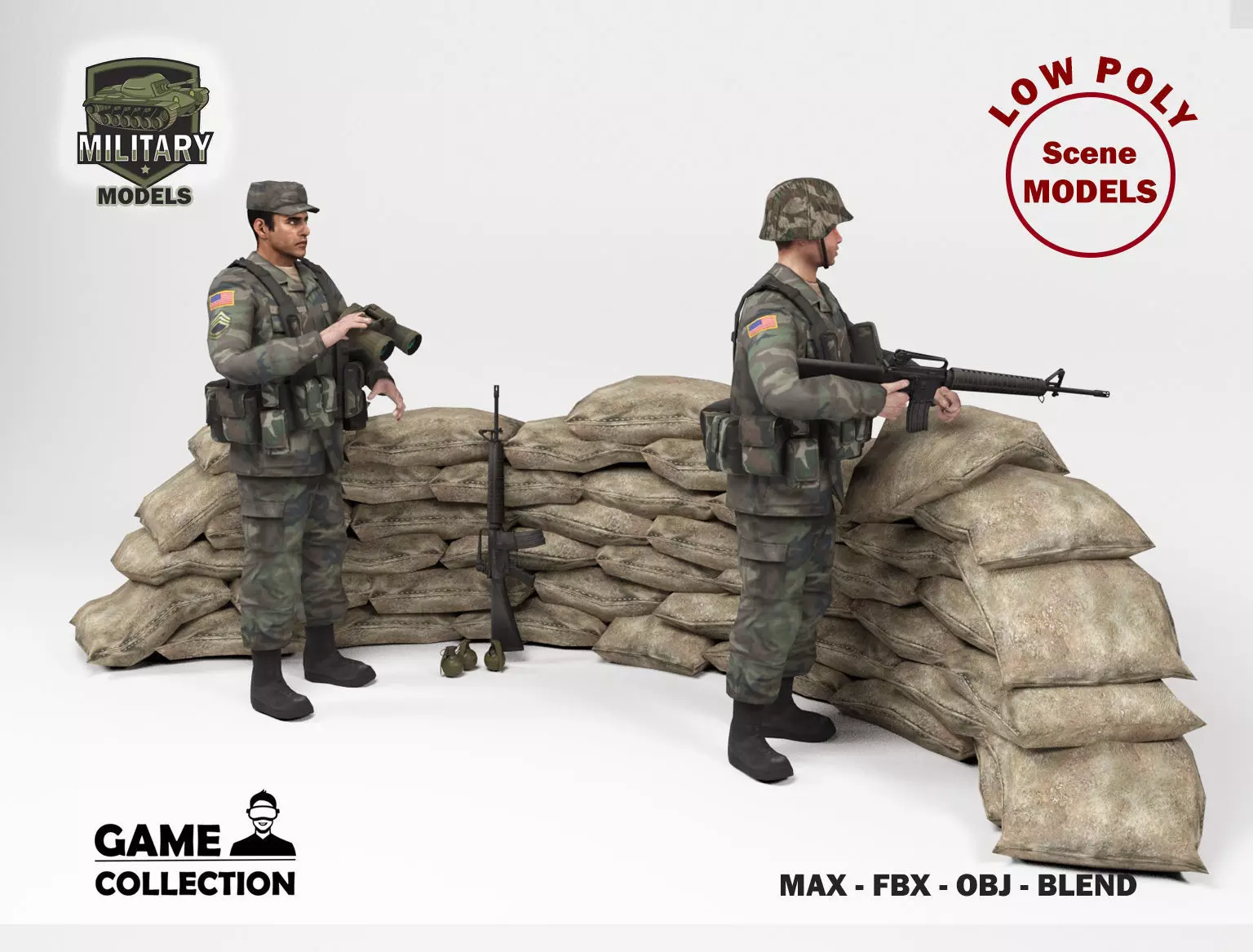 3D models of two American soldiers in a defensive position of sacks. Weapons and binoculars included. The human bodies have bones to be able to modify the postures. The models has been created with 3D Studio Max 2022 and Blender 3.3. All the models are low poly, basic but realistic and are ideal for 3D scenes that require few polygons. They can be used for advertising visualitations and also for games or applications. It has been created in different 3D Studio Max versions and also in FBX, OBJ and blend.