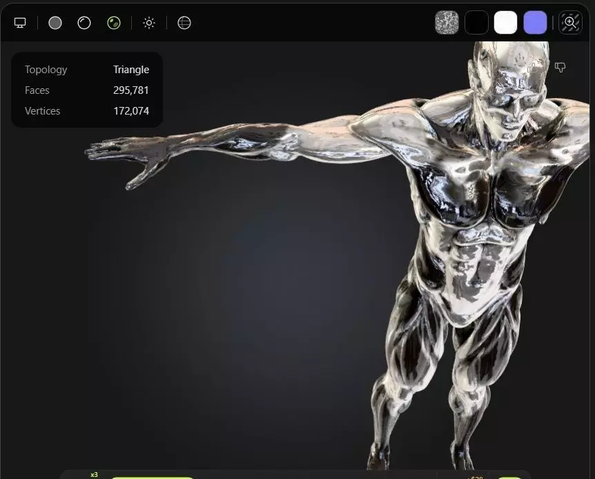 Anatomical Male Figure – Rigged High‑Poly 3D Model (Chrome Material)A detailed anatomical male character designed for artists, animators, and technical visualization. This model blends realistic human proportions with a stylized chrome material, making it ideal for concept art, motion studies, product demos, and futuristic or abstract scenes.Technical Details• Rigging: Fully rigged for posing and animation• Topology: High‑poly mesh with clean geometry• UV Mapping: Fully unwrapped and optimized• Materials: Chrome‑styled reflective shader applied across the full body• Textures: Includes mapped material setup for easy customization• Formats: OBJ, FBX, GLB, STL (adjust to your actual formats)• 3D Print File: IncludedModel Features• Anatomical Accuracy: Realistic muscle structure, proportions, and silhouette• Chrome Finish: Reflective, stylized surface ideal for sci‑fi, abstract, or display renders• Neutral Pose: Ready for animation, motion tests, or retargeting• Clean UVs: Supports custom materials, procedural shaders, or baked textures• Versatile Use: Works for educational visualization, character studies, or creative concept workUse Cases• Animation and motion studies• Anatomy reference for artists• Sci‑fi and futuristic renders• VR/AR experiences• Product visualization• 3D printing and collectible designCompatibilityCompatible with Blender, Maya, 3ds Max, Unreal Engine, Unity, and most major 3D software.