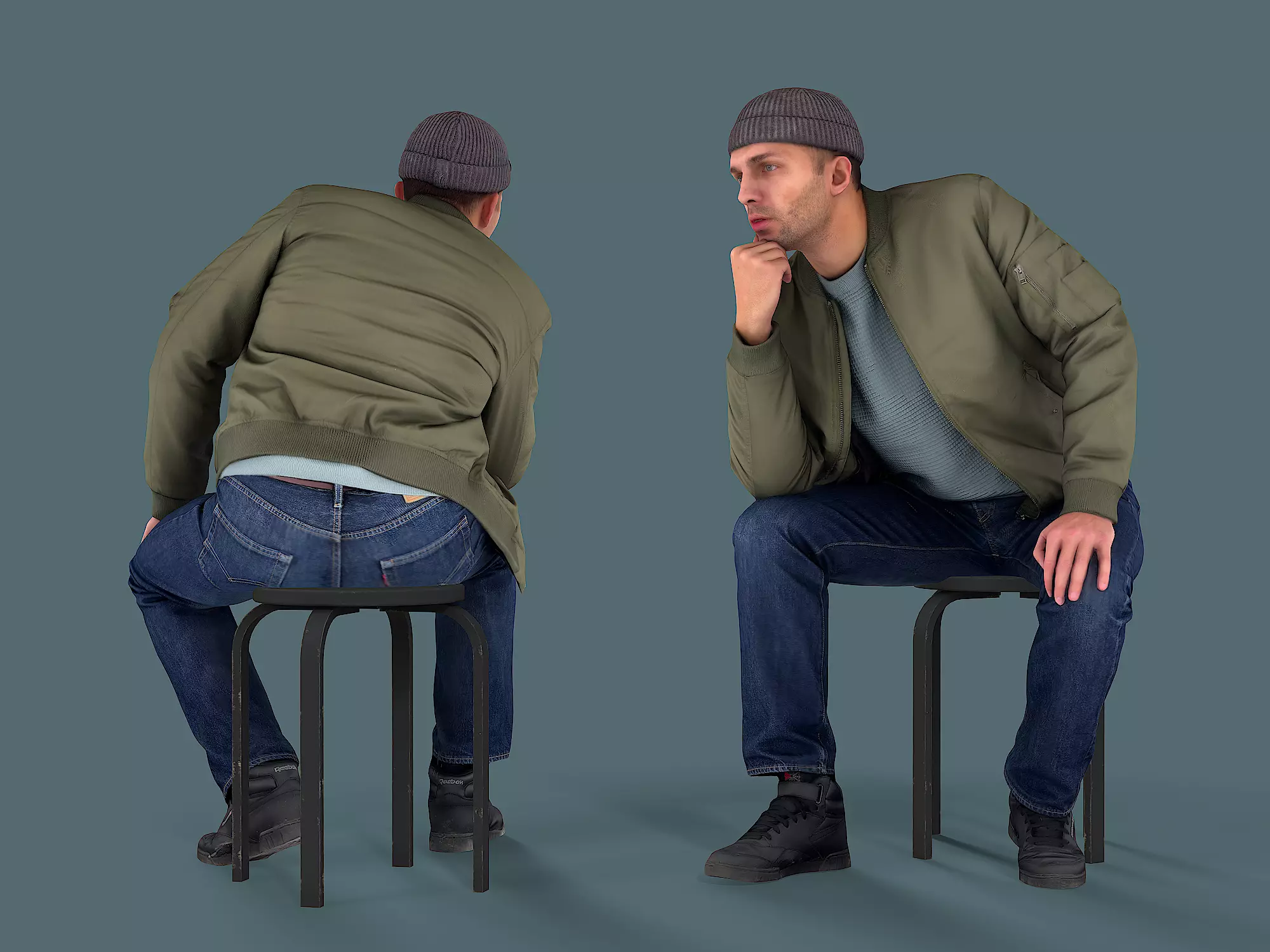 A young handsome guy with stubble sits on a chair, thinking, leaning his hand on his right knee, looks ahead. He is wearing a sweater, green bomber jacket, navy blue jeans, black trainers and a gray beanie hat.