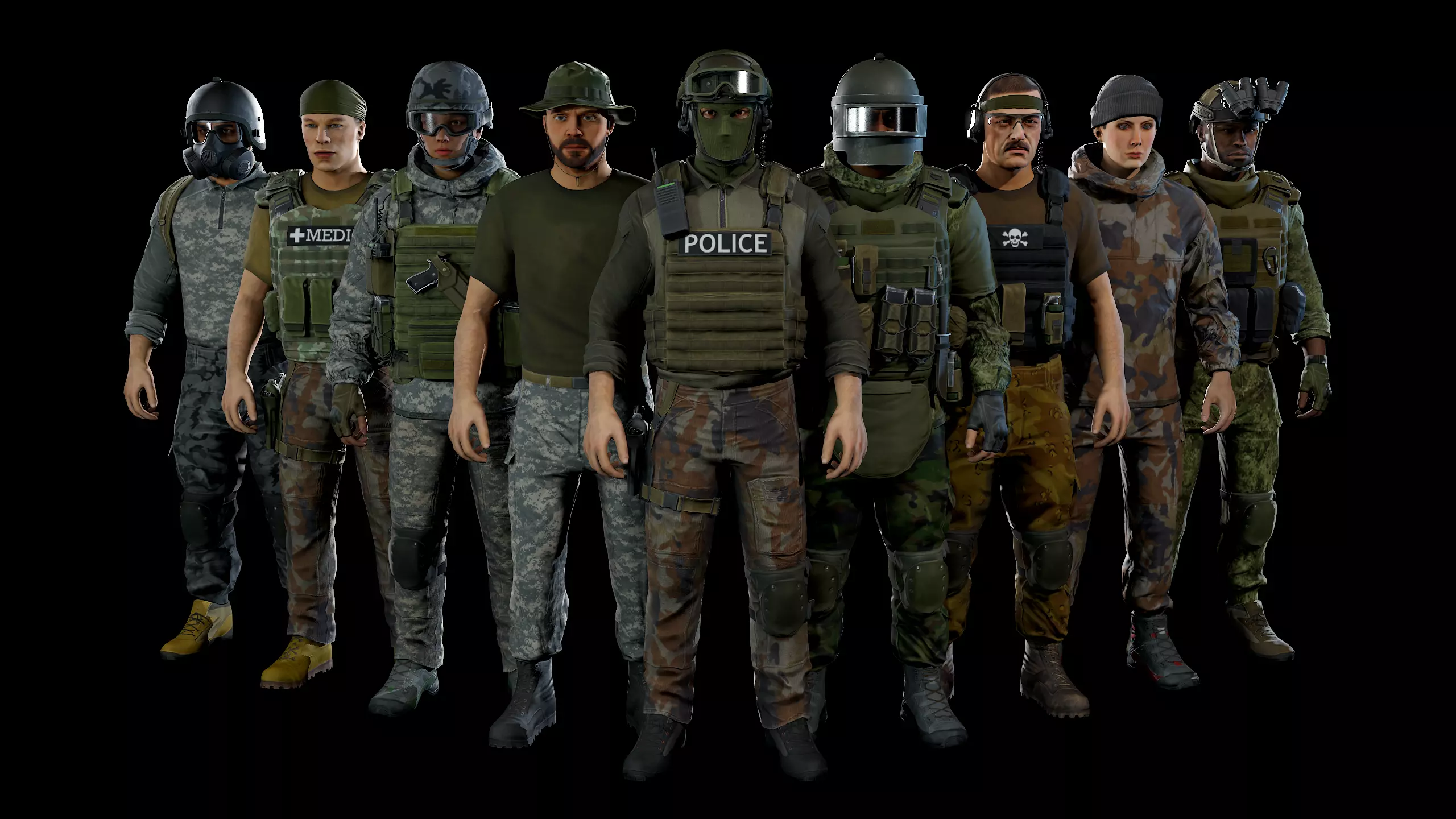 • Character have 112 modular skeletal meshes with several skins for each module: 11 Heads, 18 bodies, 3 shirts, 3 pants, 3 boots, 7 tactical vests, 9 outfit pouches, 3 helmets, 4 caps, 9 head equipments, 4 backpacks, 3 firearms, 2 holsters, 18 vest patches, 7 radio, 8 military equipments.