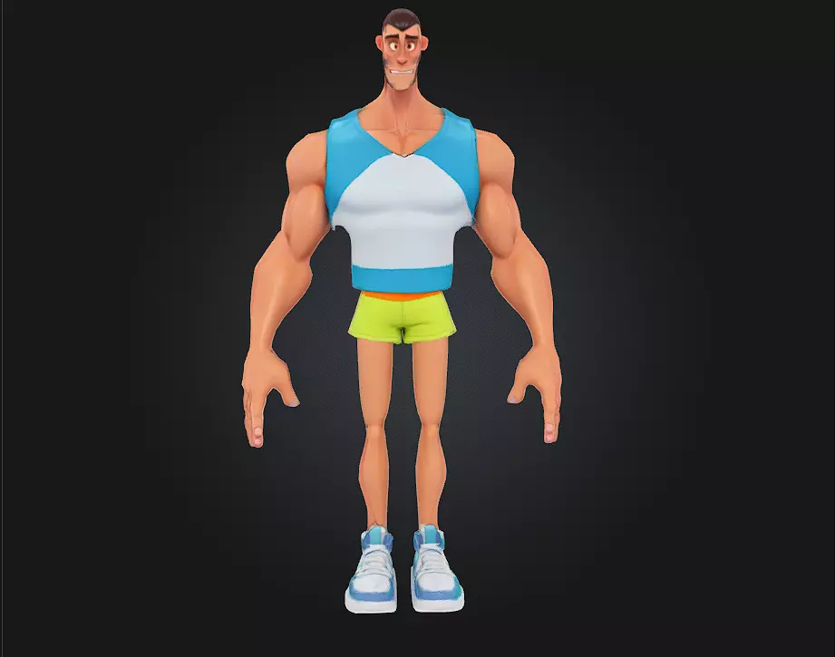 Exaggerated, cartoon-style muscular build with dynamic proportions