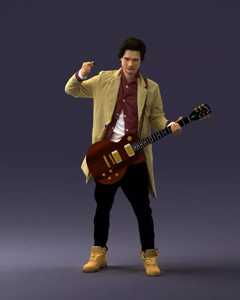 This is a 3D scanned model of a man holding an electric guitar, created using advanced 3D scanning technology for maximum realism. The character features natural proportions, detailed clothing, and an expressive pose, making it an excellent asset for creative or professional projects requiring realistic human characters.