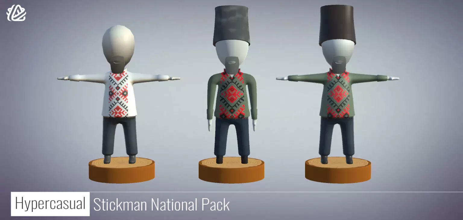 Stickman character pack. The pack includes 3 unique stickman national characters. There are 3 character models.Models can be easily used in low-poly and mobile game development.Compatible with mixamo. A low-poly set of character resources for creating games in the Hyper Casual genre.