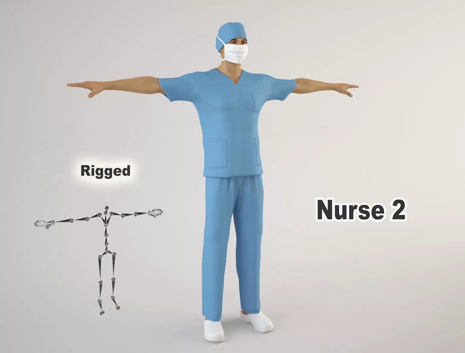 3D model of a nurse with trousers, a shirt,a mask and clogs. The model includes bones and several animations. Model ideal to be used in games, advertising and video production. Medium and low-poly models to be used easily in any project.