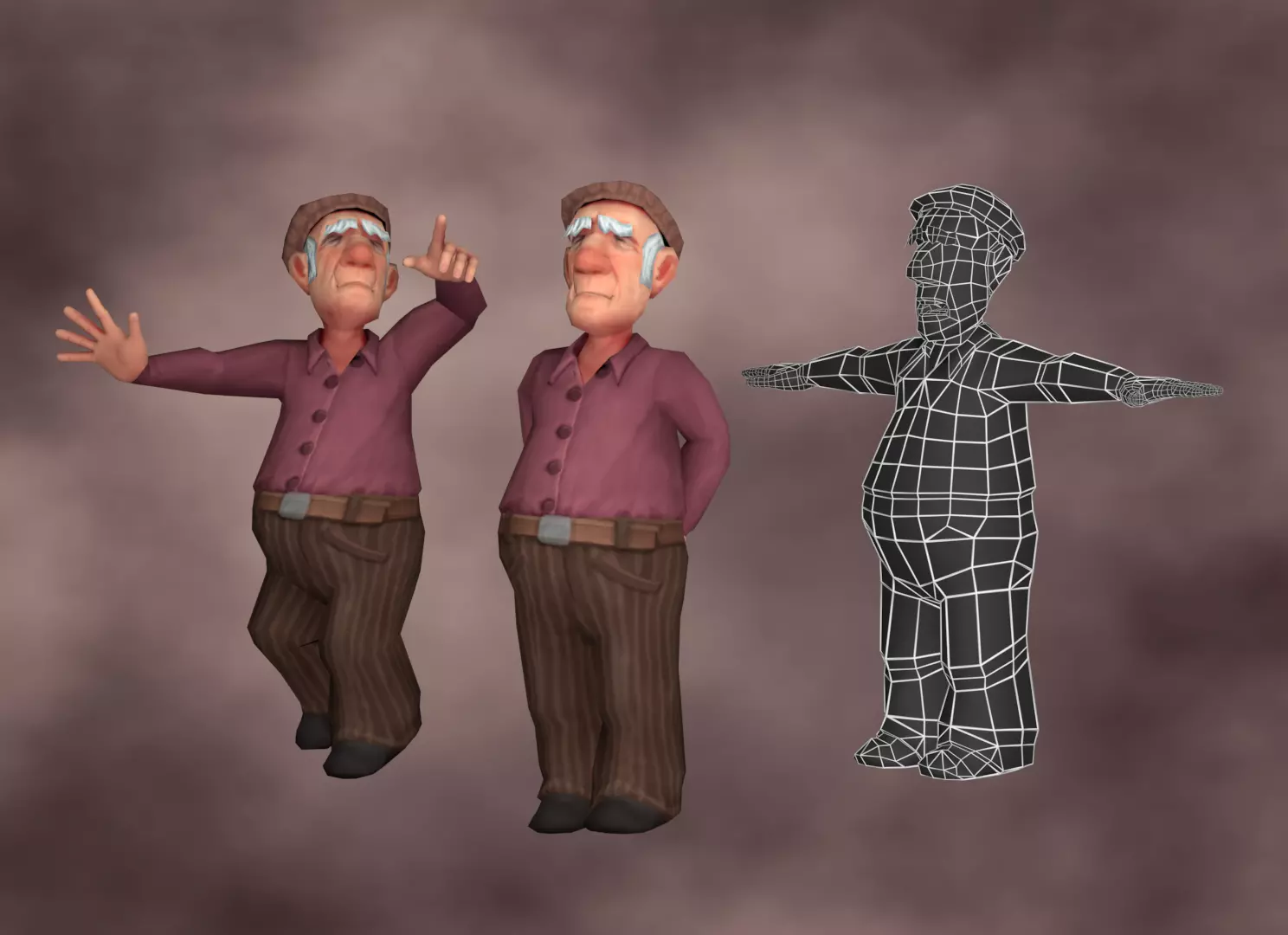 Low poly, 3888 triangles.Shaded and unlit material variants. Hand painted textures.Rigged, with some test poses and a test animation included in the oldMan_scene.blend file.The Unity package contains shaded and unlit materials. The rig* is remapped to Mecanim.