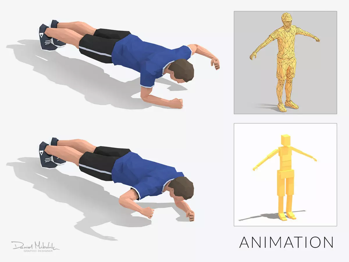 Animations of exercise Man Low poly3d model in flat surface style.Animation created in CAT system and exported to FBX files for loop sequence.Extra textures as bonus