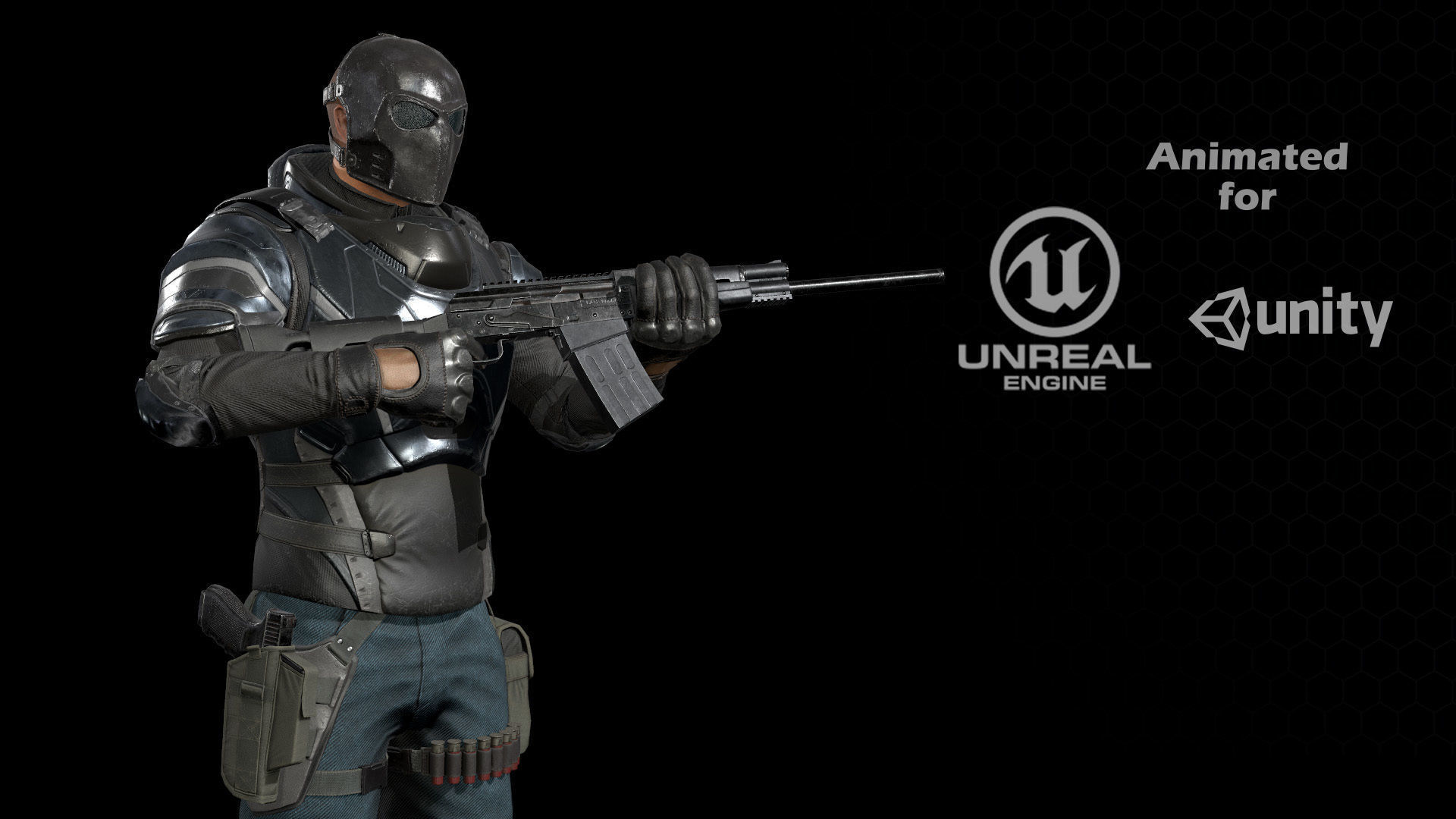 Unreal:Character is rigged to Epic skeleton and have animations from Animation starter pack for tests. Also created two additional animations (get rifle, get pistol)The project also contains individual character fragments for customization.