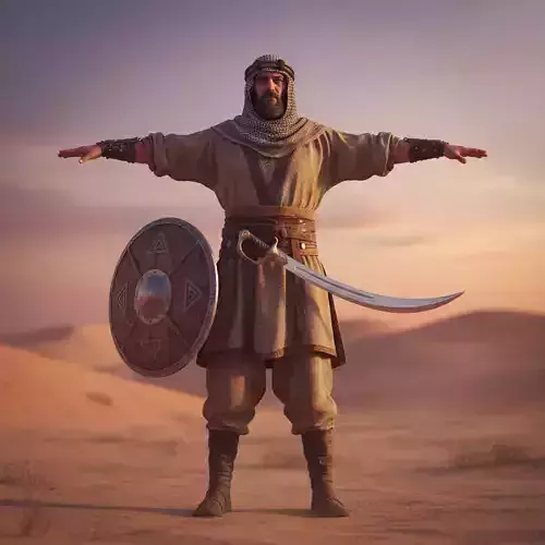 Highly-detailed 3D model of an ancient Arab warrior, designed for action games and commercial projects. The character is an athletic male, presented in T-Pose and front view, full body. He wears traditional Bedouin-inspired armor with leather, bronze, and cloth details, combining mobility with historical authenticity. His confident expression reflects strength, courage, and heroism.