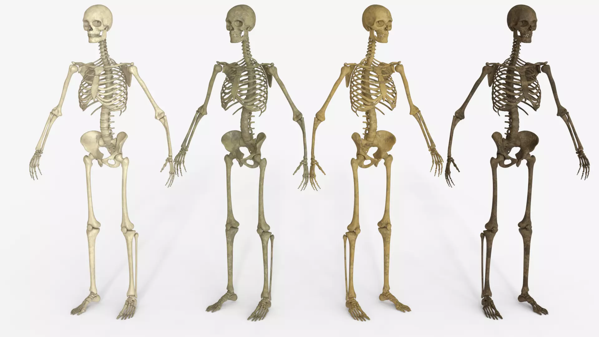 High-quality realistic human skeleton 3D model designed for games, medical visualization, education, and cinematic rendering.This model features accurate anatomical proportions and includes multiple texture variations representing different bone conditions (clean, aged, dry, and dark/weathered).