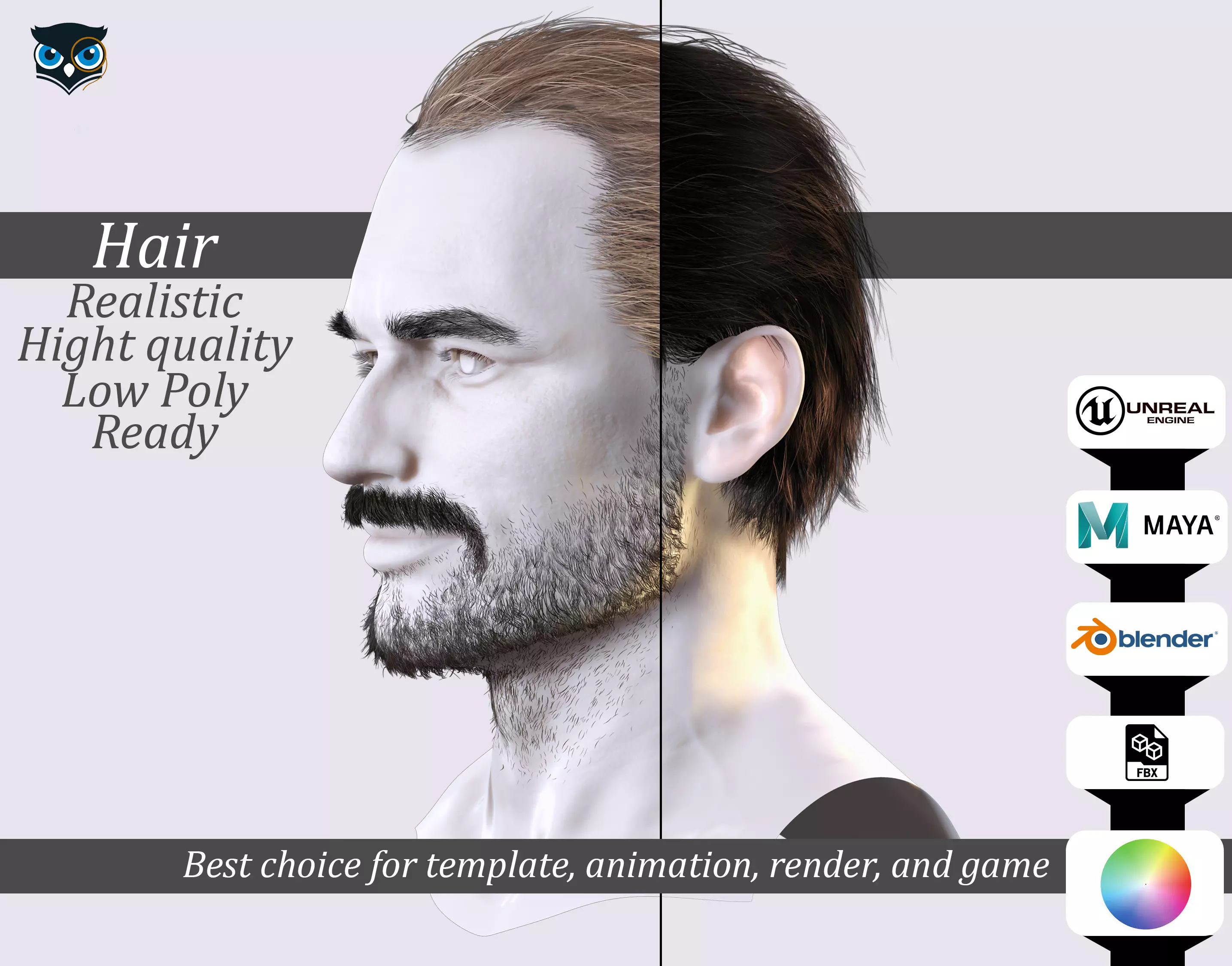Realistic Male Hairstyle and Beard - Game Ready 3D Model Low-poly 3D model