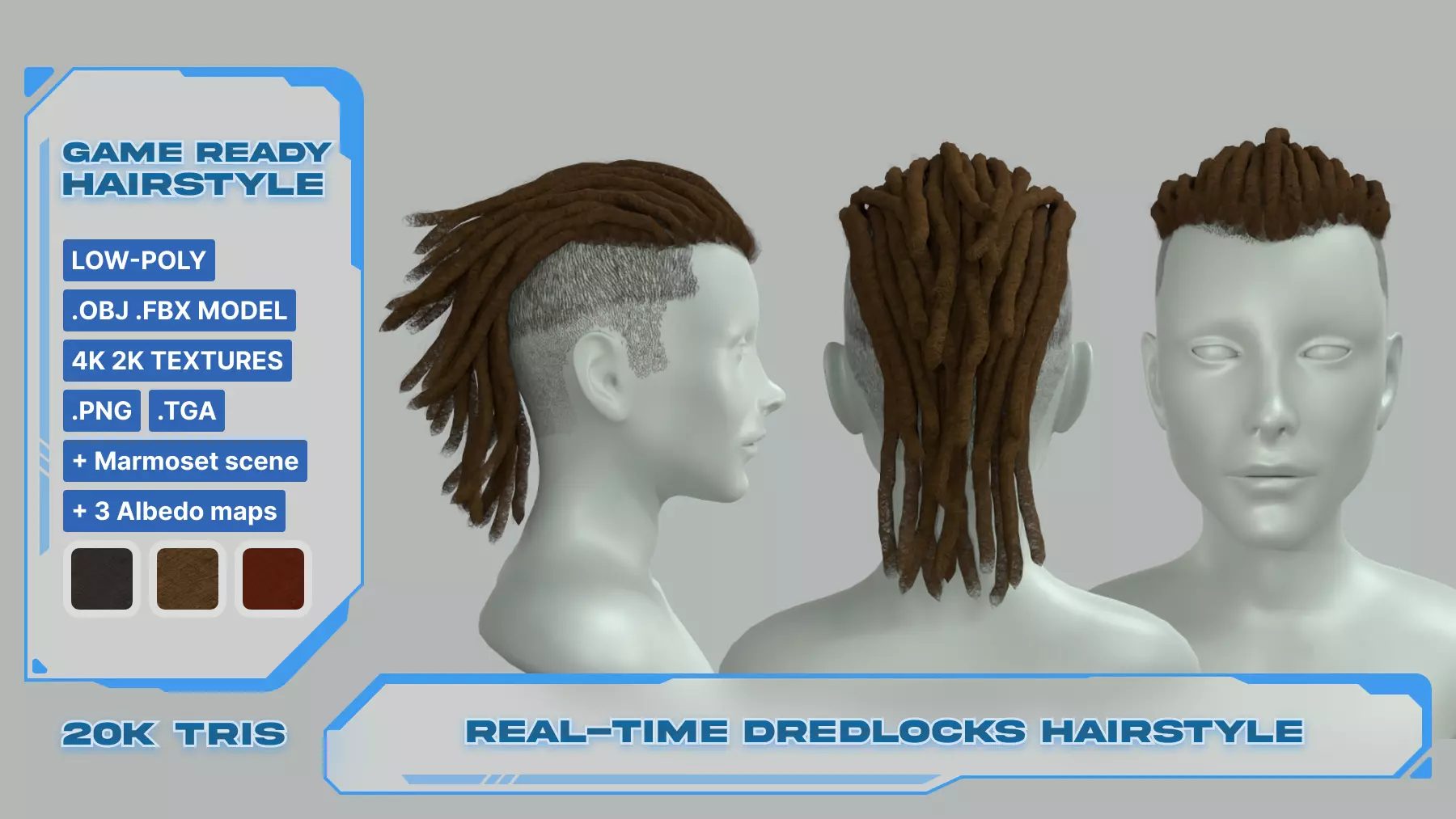 Real-time game ready low poly men dreadlocks hairstyle dreads male hair for Unity and Unreal Engine
