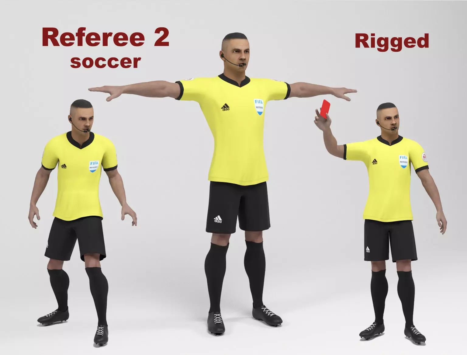 3D model of a Referee of football with shorts, t-shirt, socks and boots (whistle, microphone and cards included). The model includes bones and four sample animations. Model ideal to be used in games, advertising and video production.