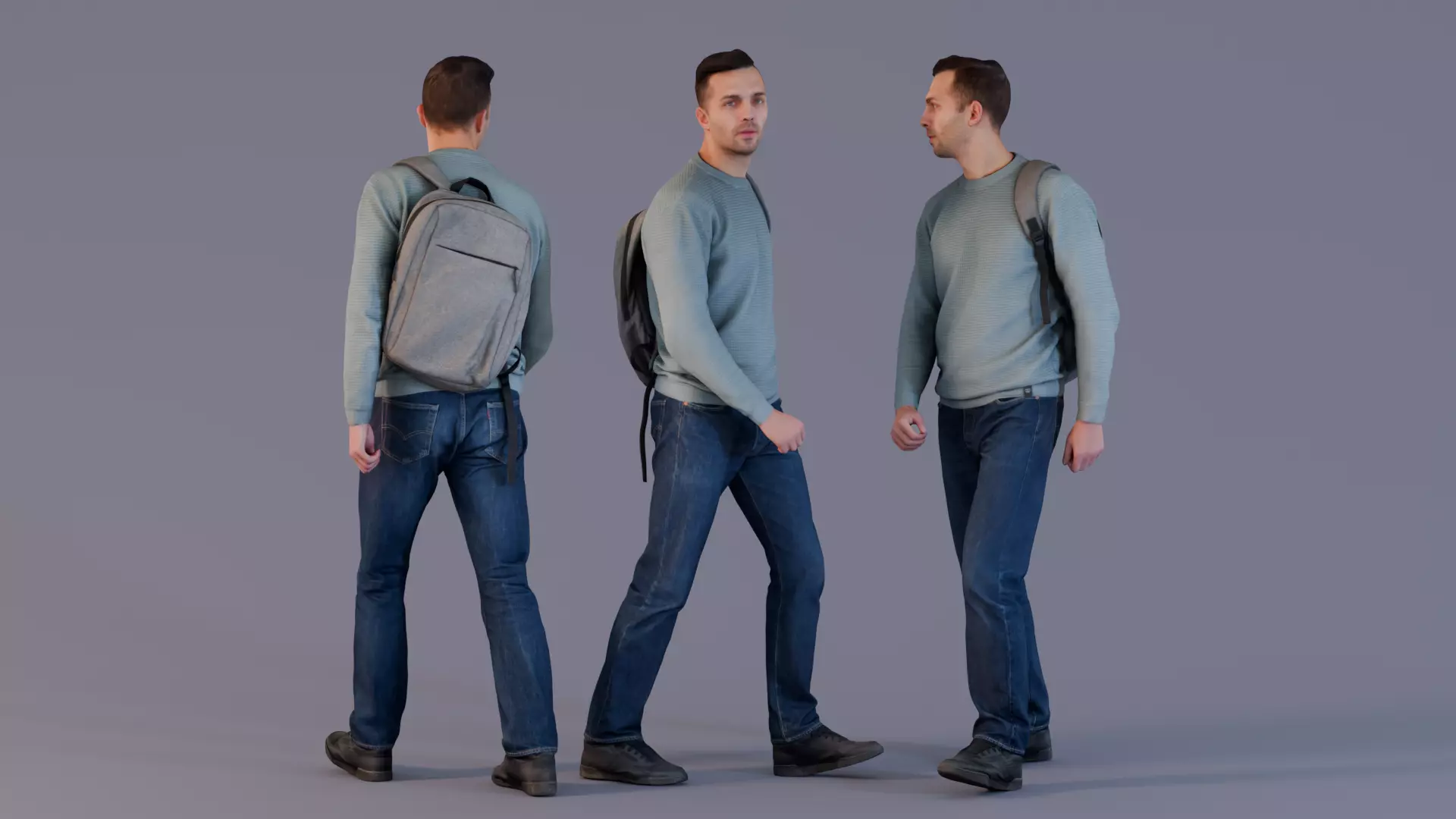 This photorealistic 3D model features a young man walking confidently while wearing casual attire. He is dressed in a simple yet stylish long-sleeve sweater paired with dark jeans, complemented by a casual backpack, giving him a laid-back but purposeful appearance. His natural stride and posture make him a great fit for scenes depicting everyday urban life, student environments, or pedestrian backgrounds.