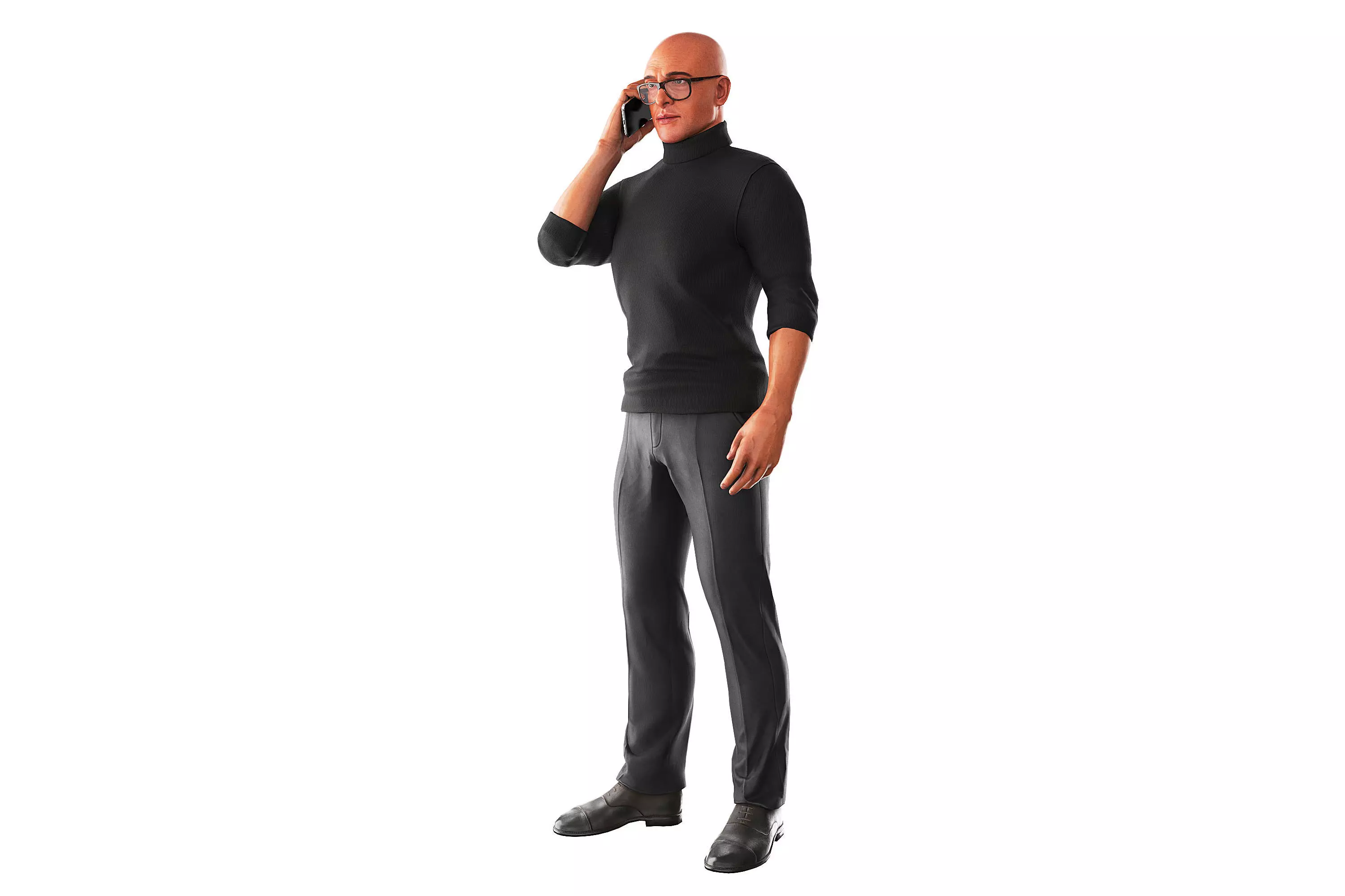 A man in black golf talking on the phone.Ready-posed 3D human models for 3D visualization