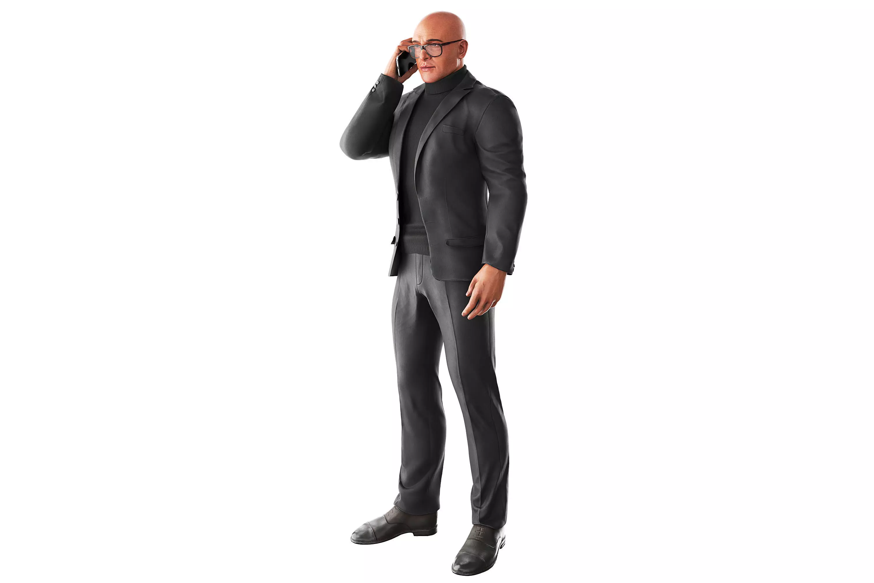 A man in a black business suit talking on the phone.Ready-posed 3D human models for 3D visualization