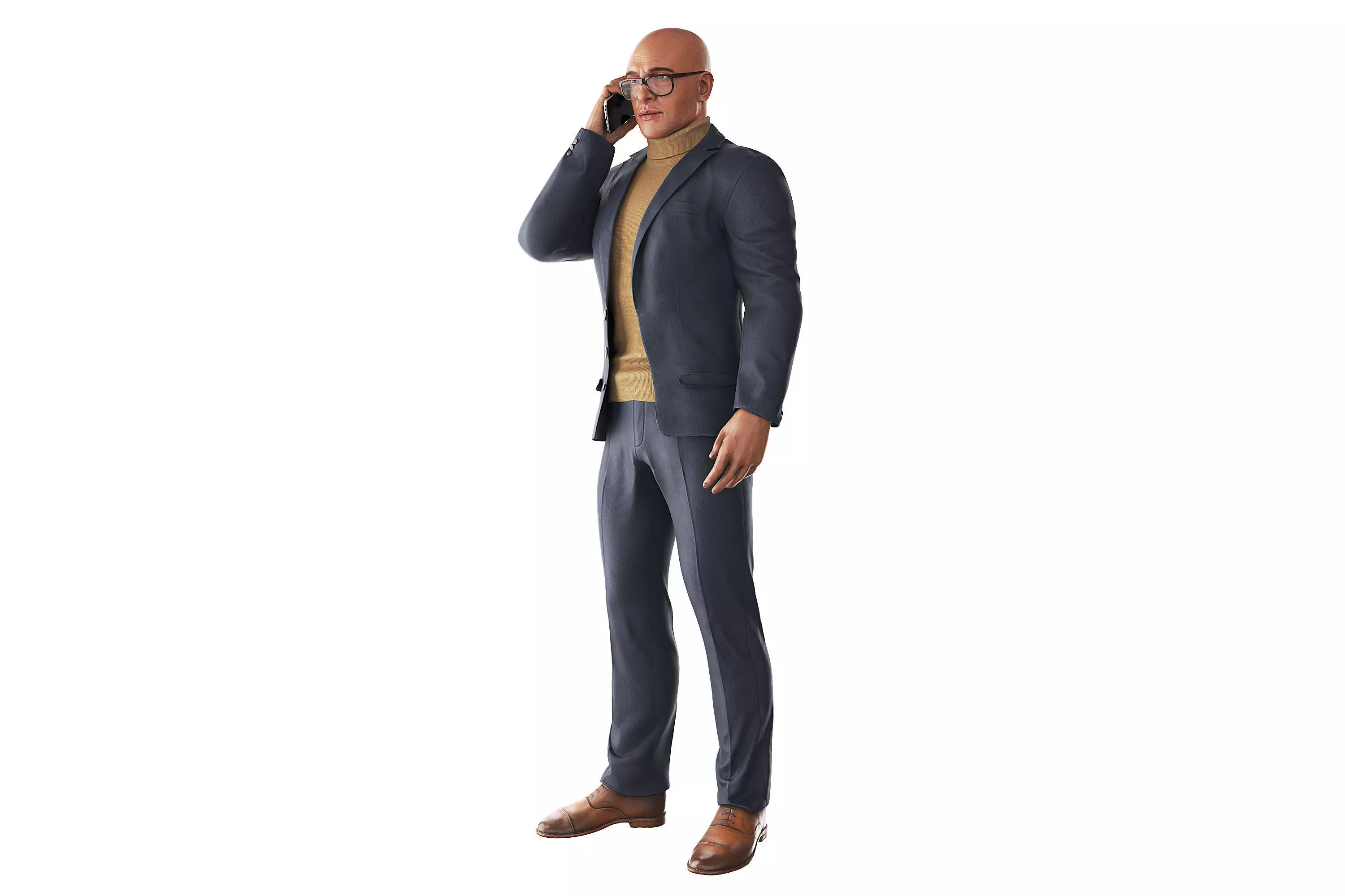 A man in a blue business suit talking on the phone.Ready-posed 3D human models for 3D visualization