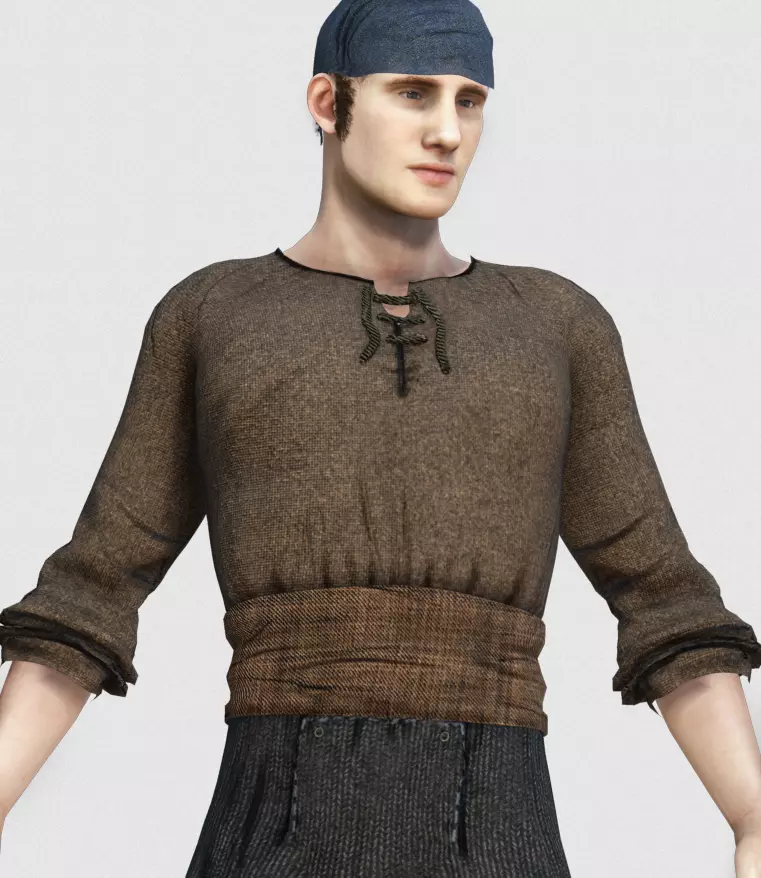 This realistic 3D character represents a young Spanish peasant from the early 19th century (circa 1810), ideal for historical simulations, period games, or cinematic environments. Modeled with historical accuracy, the character features a rugged linen shirt with a chest cord closure, woolen sash, high-waisted flap-front trousers, and traditional espadrilles. A dark headscarf adds authenticity, making him suitable as a guerrilla, rural worker, or stealthy scout from the Napoleonic era.