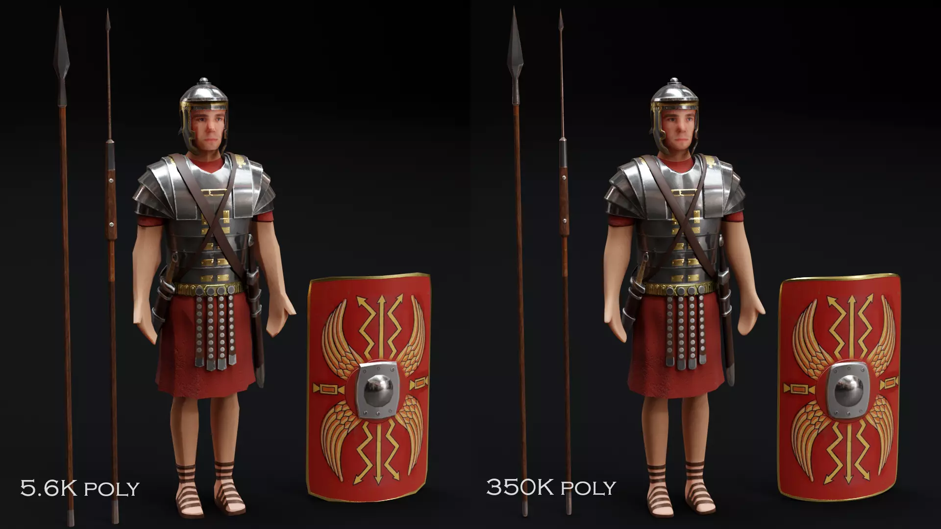 THIS MODEL CONTAINS:1 Low Poly Roman Soldier with spear, javelin, sword, dagger and shield1 Mid/High Poly Roman Soldier with spear, javelin, sword, dagger and shield1 Low Poly Roman Soldier in battle pose