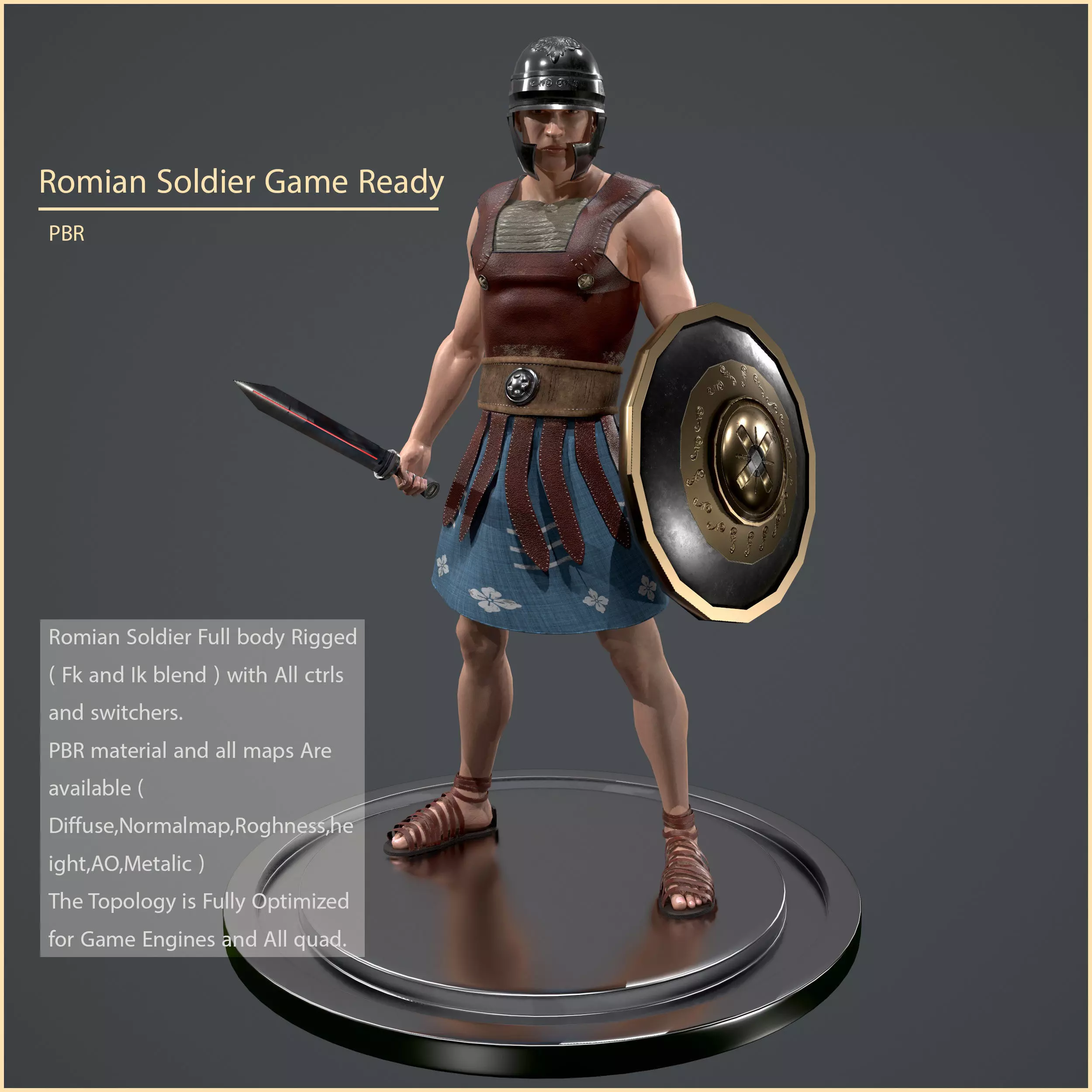 Romian Soldier Full body Rigged ( Fk and Ik blend ) with All ctrls and switchers.PBR material and all maps Are available ( Diffuse,Normalmap,Roghness,height,AO,Metalic )The Topology is Fully Optimized for Game Engines and All quad.